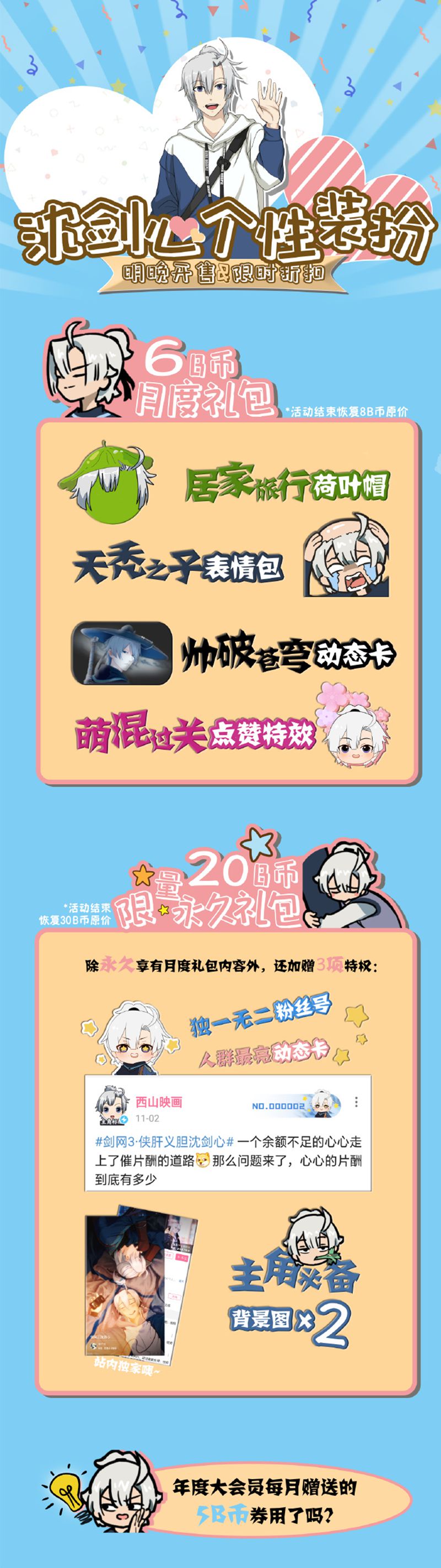 鼠年迎新春,《剑网3》新春盛典正火热进行当中!五档充消领好礼、双倍积分大返利、小额福袋抽大奖、充值时间返点卡等诸多福利活动回馈侠士,还有诸多经典春节活动抢先上线,烘托节日氛围,侠士通过参与活动还将获得节日活动挂件、跟宠、称号等海量奖励! 迎新年,换新衣,在新春盛典到来的同时,《剑网3》商城中也上线鼠年新春包身礼盒“浮世兰舟”、联赛冠军礼盒“万里乘风”、首款腰部互动挂宠“龙猫”、贺岁红发“染枫意”、红发小头像“焰心” 、特效外装“清夜幽怀”以及趣味生肖帽“子神冠”等精美的外装好礼以供侠士装扮挑选,迎接春节的到来! 自昨晚开售后,便有不少侠士晒出了他们换上新装的精美靓照,这其中不乏有许多令人眼前一亮的优秀作品!它们展现了大唐侠士的不同新春风貌,或可爱,或温婉,或帅气,或美艳!资讯君在第一时间收集了来自各位侠士的神仙返图与大家一同分享! 新春外装玩家返图: @大长腿岚岚 @·葵崽· @LyanYnnn @Redoublage @宝贝早点睡好吗 @虫小音 @逢尔蓝桥上 @疯来吴山渣 @璘白 @卿玖唳 @雀雀的魔法 @-汀岸渊雪- @卧倚清风闲看花 @小枫挽 @月清x 【快乐源泉来了 《剑网3·侠肝义胆沈剑心》第4集更新】 又到了侠士们心心念念的周五时光,侠士们的快乐源泉也将于今日中午12:00在B站准时与侠士们见面!第三集今日免费更新,大会员还能多看一集! 前往观看《剑网3·侠肝义胆沈剑心》第二季:观看地址 此外,沈剑心B站个性装扮套装限量售卖中!想要成为拥有酷白发,荷叶帽,帅裂苍穹的主角标的配帅小伙(天秃之子)吗?想使用心心专属表情包成为评论区最亮眼的那个崽吗?赶紧前往“个性装扮”收获这份粉丝的专属装扮吧!在活动期间,仅需20元即可拥有全部7项《剑网3·侠肝义胆沈剑心》的装扮内容,B币券也可使用哦~《剑网3·侠肝义胆沈剑心》主角沈剑心系列周边现已上线,侠士可前往官网、剑网3推栏APP以及B站西山映画官方沈剑心周边旗舰店进行购买,将心心带回家! 与此同时,随着春节的临近,《剑网3》也将在近期为侠士们带来2020年的一些开年新规划,相关内容将于近期公布,诚邀侠士保持关注! |