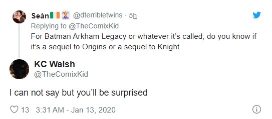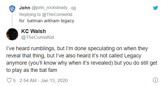 之前华纳蒙特利尔就曾经暗示过自己正在开发一款《蝙蝠侠》系列游戏新作,而据内部人士的KC Walsh最近在推特上透露,华纳蒙特利尔正在开发《蝙蝠侠》阿卡姆系列游戏的新作,将首先针对次世代主机开发。目前尚不清楚该游戏的次世代主机版是否已发布,但根据KC Walsh的话来看似乎它即将发布。 推特上有玩家问道:“这款新作有没有多人合作系统,或者是复仇系统?”KC Walsh回答道:“虽然我也想告诉你,但是不行,我只能说,这款新作将首先面向次世代主机开发。” KC Walsh还表示,新的“阿卡姆”系列将不会像去年传闻的那样叫做《蝙蝠侠:阿卡姆遗产》。但是,游戏的主要功能之一(可以同时扮演多个角色)不会改变。 尽管没有太多关于这款游戏的消息,但KC Walsh表示这款游戏会让玩家感到惊讶,当有玩家问到这款新作是《蝙蝠侠:阿卡姆起源》还是《蝙蝠侠:阿卡姆骑士》的续作时,KC Walsh说,新的“阿卡姆”游戏可能是该系列的重启。 至于新《蝙蝠侠》阿卡姆游戏何时发布,KC Walsh表示他不能说。他听说,关于新作的更多消息将会继续公布,但是由于玩家会有不同的反馈,这些情况有可能会发生变化。 |