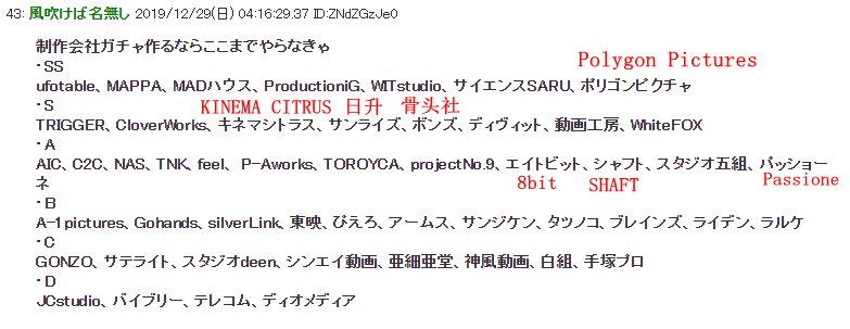 日本动漫产业高度发达带动了诸多动画公司的兴起,其中总有个高下之分,当然官方评选是不太可能出现了,而日本网友们心中早已经有了孰优孰劣的归属,一起来看看日本网友心中的动画公司实力大排名吧。 ·首先晒出的是按照星标珍稀度的排名,这么多年来各大动画公司的作品代表了其整体制作水平的高低排名: ·而如果按照扭蛋界的通用标准来分的话,有别的网友觉得应该这么排: ·那么问题来了,日本这么多知名动画公司你到底喜欢哪一些呢? |