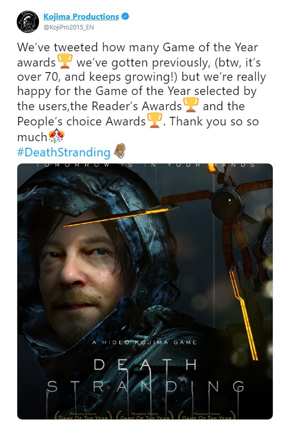 之前,小岛工作室在推特中庆祝《死亡搁浅》收获了65个年度最佳游戏的奖项。近日,小岛工作室又发推特庆祝《死亡搁浅》收获了70个年度游戏的大奖。 小岛工作室在推特中写道:“《死亡搁浅》之前获得过很多年度游戏大奖我们都发过推特,(顺便说一下,《死亡搁浅》现在已经获得了超过70个年度游戏大奖)但是我们非常高兴被the users,the Reader’s Awards以及the People’s choice Awards选为年度最佳游戏,谢谢你们。” 目前,《死亡搁浅》现在已经获得了超过70个年度游戏大奖,仍然排在今年游戏获得年度游戏数量的头名,《死亡搁浅》现已登陆PS4,PC版《死亡搁浅》将会在2020年夏季发售,并且支持简体中文。 |