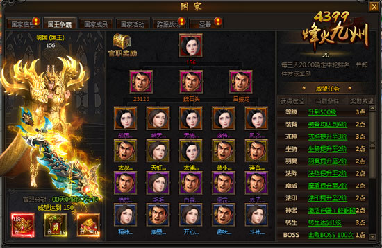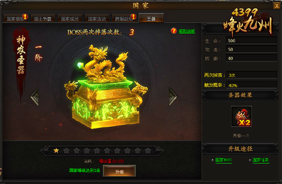 国家是《4399烽火九州》中的一个核心玩法,玩家可建设国家,和敌对阵营PK,在跨服战场寻找更多乐趣。成为国家的一份子,为国而战! 国王争霸: 国王和官职由威望排名产生,玩家通过完成威望任务可以获得威望值,争夺国王或者官职,获得更多特权 国家圣器: 国家圣器可以让BOSS被击杀时再爆一次掉落。通过完成国家任务,国家BOSS活动,提升国家等级可以提升国家圣器等级,获得更多再爆一次掉落 跨服战场: 跨服战场是和敌对阵营进行PK的大战场,占领据点,争夺跨服BOSS,这是证明谁才是最强王者,征服世界的舞台 《4399烽火九州》是一款充满东方魔幻元素的2D多职业角色扮演类网页游戏。玩家通过扮演三个战斗技能丰富、风格迥异的传奇英雄,在遍布洪荒妖魔的九州大陆上书写下属于自己的史诗篇章。 4399游戏吧是4399游戏推出的专业的中文休闲游戏社区。不仅网罗了最酷炫最好玩的精品游戏,更集合了最新鲜最缤纷的相册广场,结合最多元最丰富的群组互动。《生死狙击》、《皮卡堂过家家》、《天空之舞》、《美食大战老鼠》、《飘渺西游》、《航海王OL》、《葫芦娃》、《TOUCH热舞》、《水煮三国》、《核金弹头》、《枪魂》、《小小突击队》、《斗罗大陆》、《火线精英》、《完美漂移》……更多精品游戏,请锁定4399游戏吧。 |