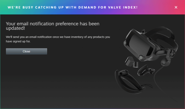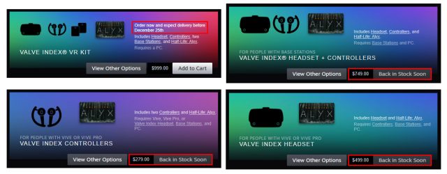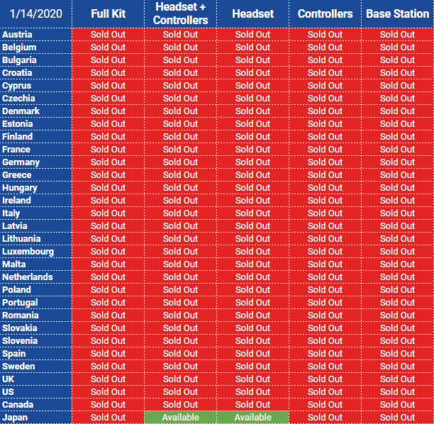 根据RoadtoVR网站的多次检查,在上架两个月后,V社自家的高端VR头戴设备Index已经在有售的31个地区全部售罄,热度非凡。 从下图中可以看到,除了日本地区还有残留的头显和控制器外,其余所有地区的任何一种套装都已经卖断货,连单买一个基站或者控制器都不行。 V社显然已经知晓Index的大卖,在其Valve Index的官网处处可见V社安抚玩家的信息,一再声明“我们正在努力满足玩家们对Index头显的需求!”同时V社建议玩家登陆后绑定邮箱开启邮件通知,一旦有新的库存立马会通知玩家。 在本周V社的发言人也告诉RoadtoVR网站:“我们正在加班加点生产更多的Index来满足高需求量。目前目标是在《半条命:Alyx》发售前让供货有所保障。” |
