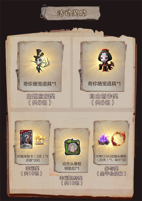新年的钟声即将敲响,庄园的欢歌已经开唱。《第五人格》大神冲榜S2赛季——“新春快乐”强势来临!参与S2赛季大神冲榜,发布游戏攻略、同人、视频等原创内容,即有机会赢取奇珍时装、限定头像框和大神开屏单人海报推广奖励!同时,在网易大神投稿你的《第五人格》年终总结,也有机会获得奇珍随宠道具、奇珍时装体验卡和头像框福利。快快前往第五人格的庄园,和大神一起迎接新年的到来吧! 【S2赛季大神冲榜 奇珍道具等你拿】 庄园达人齐冲榜,欢声笑语庆新年。1月6日-1月20日,前往#第五游戏日常#话题,发布关于1月游戏活动、更新、调整的相关攻略、同人、视频等原创内容,即可收获影响力,冲击大神S2赛季榜单!最终榜单的榜首将获得游戏内“亚历山大”头像框、在售奇珍时装和大神开屏单人海报推广奖励!前10名的玩家将获得奇珍物品、大神喷漆和碎片奖励。另外,在#第五游戏日常#话题内参与转发评论,即可获得大神“岁寒双喵”纪念头像框,还有机会成为锦鲤,获得幸运礼包福利! 【投稿年终总结 赢第五奇珍道具】 开黑时的欢声笑语,冲段时的坚持不懈,脱非时的欣喜若狂,过去的一年里,庄园里的哪件事让你最难忘?1月9日-2月2日,网易大神《第五人格》“我的年终总结”活动来袭。根据指定模板或自由创作年终总结视频或应援视频,或用一句话说说自己的第五人格年终总结,发布到#我的第五年终总结#投稿专区,就有机会获得奇珍随宠道具、奇珍时装体验卡、动态头像框等精美道具奖励。玩家只要参与投稿就能领大神COA3应援头像框和碎片*20,优秀作品更有机会入选第五人格应援主题视频,快来和大神一起C位出道吧! 【关于“网易大神”】 网易大神是网易游戏旗下的精英玩家社区。这里汇聚了广大精英玩家、游戏圈红人、行业大咖,集合了网易独家的官方资讯和福利趣闻,旨在为玩家打造一个丰富的游戏兴趣社交圈。玩家可以在网易大神与游戏中的好友实时聊天、多元互动;以游戏会友,结交更多游戏同好,和大神一起发现更多游戏乐趣。 |