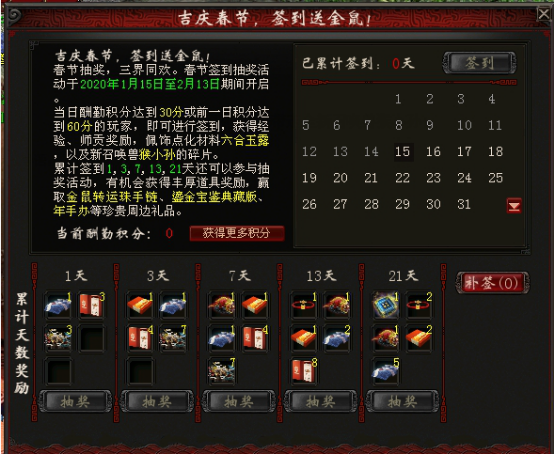 大家期待了很久的猴小孙终于来了!2020年1月15日至2月13日,大话2免费版春节签到活动正式开启,不仅可以获得丰厚的经验、师贡奖励,还能获得猴小孙碎片合成超萌猴小孙!更有金鼠转运手珠、2019鎏金宝鉴典藏版、五常神兽手办、珍稀年手办等珍贵周边可以领取! 2020年1月15日至2月13日,当日酬勤积分达到30分或者前一日积分达到60分的玩家均可参与签到,签到即可获得经验、师贡奖励以及六合玉露和猴小孙碎片。 六合玉露:春节资料片重要道具,可用来对佩饰进行属性点化。 猴小孙碎片 累计签到第1、3、7、13、21天还能够参与抽奖,有机会带走金鼠转运手珠、鎏金宝鉴典藏版、五常神兽手办、年手办、大话日历、大话新年礼盒、LOVO家纺四件套等众多好礼。这过年的礼物都准备上了,就等兄弟你来签到了! 同时我们还有贴心的补签计划,累计签到第5天、第10天、第15天均可获得一次补签机会,有当日忘了签到的小伙伴也不要着急,只要补签同样有机会抽取大奖! 每天日常任务做一做,就能获得参与签到,白送的经验和好礼你不拿岂不是亏了?现在就上线,做任务参与签到,带走猴小孙,赢走海量新年贺礼! |