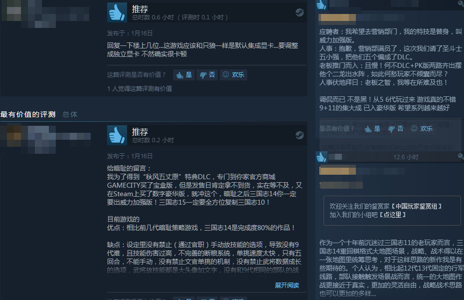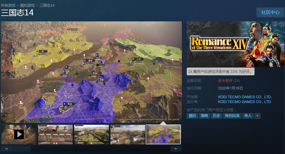 今日(1月16日)《三国志14》在Steam上正式发售,标准版售价349元,豪华版售价507元,游戏支持中文。官方表示中文语音正在进行植入,日后免费更新。该作在Steam上评价为“多半差评”,好评率为33%。许多人表示不太适应新作地图风格,游玩时有卡顿现象发生。 《三国志14》是由日本公司光荣特库摩制作发行的一款三国题材策略类游戏,是《三国志》系列最新续作。该作以三国乱世为主题,群雄逐鹿,乱世英雄辈出的水墨画3D回归。《三国志14》中有超过1000名个性丰富的武将登场,玩家需活用君主与麾下武将拥有的“个性”,量身制定合宜的战略。 给出好评的玩家认为与前几代相比,《三国志14》的完成度很高,游戏内容丰富。游戏地图精致,人物更加生动富有表现力。游戏配乐效果不错,武将设计好评,AI提升。游戏设定也很合理,有真实的味道了。 给出差评的玩家则认为游戏内政简化后感觉有些枯燥,没有结交,结拜和结婚感觉很乏味。有人进游戏后黑屏,还有人画面卡住不动。有玩家表示游戏优化有问题,玩着玩着就卡成PPT了。希望官方能尽快解决这些问题。 |