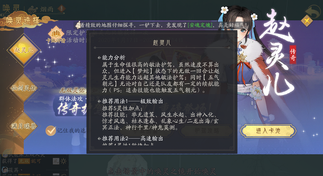 轩辕剑VS仙剑,你会更喜欢哪一个?这个问题恐怕会难倒很多人,作为上世纪单机游戏黄金时代的巅峰之作,“三把名剑”在老玩家心目中的地位不可撼动,“大宇双剑”更是以其承载的情怀,独具一格的剧情玩法成为国产RPG游戏经典中的经典。 如果说轩辕剑以苍生大义、家国天下的国恨家仇令人扼腕唏嘘,那仙剑奇侠传则以柔情似水的儿女情长赚足了一代人的眼泪。一个波澜壮阔,一个凄美曲折,以“情”为驱动力,逐步领略到“侠”的精神含义,完成使命,实践正义,最后完成了自我成长。 因此回到一开始的问题,在轩辕剑VS仙剑中选择其一,斟酌思量许久后还是难以抉择,所幸在1月15日,网易出品的《轩辕剑龙舞云山》中,开启了一个神仙联动:轩辕剑X仙剑奇侠传,将双剑IP融合在一起,二者经历漫长时光重逢云山,双剑合璧威力无穷,又会给我们带来怎样的惊喜呢? 本次双剑联动第一波,共有4个内容:巅峰挑战、情动双剑、灵儿特典、仙音缥缈,同期还有灵佑福利等春节限定活动开启,都在为整个联动服务。目前只是第一波联动内容,后续还会有新剧情加入,紧跟着率先推出的绝美的“赵灵儿”护驾,逍遥、林月如护驾也会继续推出。 就目前已经开放的情动双剑、灵儿特典来看,这次联动的质量可数上乘,情动双剑主线剧情衔接自然,且能够很好地保留双剑各自的特点;灵儿特典则以全新的传奇护驾赵灵儿引发了玩家的热烈讨论;仙剑音乐专场,《蝶恋》、《比武招亲》、《乐逍遥》、《风起云涌》、《酒剑仙》等经典音乐也会一一呈现,让所有玩家重忆起当年仙剑带来的感动;而巅峰挑战中即将开放的仙剑之战,也足够让人期待。 双剑合璧 一段穿越时空的羁绊 《轩辕剑龙舞云山》的剧情是以“安史之乱”唐明皇和杨贵妃的故事开篇,玩家轩辕之力觉醒,进入伏羲宫见到宇文拓,为了封印天之痕回到未来。在不断练级的冒险途中,我们也重温了一遍云和山的彼端和天之痕的动人故事。 游戏等级到达70级,轩辕主线会进入春节剧情情动双剑,魔王属下崔乾佑唤醒上古凶兽“夕”,成为了玩家封印天之痕途中的一道新的阻碍。为了能够更好地应对“夕”的危害,玩家需要和宇文拓、于小雪一起寻找能够使用“天蛇杖”和“圣灵披风”的女娲后裔。 在剧情推进中可以看出,因为昆仑镜本身有着穿越时空的设定,所以在双剑的剧情衔接上不会显得突兀,内在逻辑完全可以说通,《仙剑奇侠传》剧情的加入中也设置了经典桥段。 使用“空格剑”寻找美酒,攻略逍遥 林月如与逍遥锁妖塔一路过关斩将,攻略灵儿 在剧情过程中,第一次遇见上古凶兽“夕”,玩家只需要坚持过第三回合,夕就会自行逃跑。之后,将会正式进入寻找女娲后人的剧情之中。 (能拖多久拖多久——因为你打不过他) 随着剧情指引,南巫灵会将天蛇杖、圣灵披风留给玩家,身为女娲石转世的于小雪无法使用,只有拥有女娲血脉的人才能驱使,回去找到宇文拓,利用神器的力量打开了镜城,这时,赵灵儿,用和她最开始出现在玩家面前的姿态,出现了。 继续推进剧情即可得到活动坐骑 携手同游 仙剑灵佑伴你闯荡江湖 在春节活动灵佑迎新春中,根据剧情指引,即可获得灵儿、逍遥、月如三位灵佑加入。每个角色的灵佑剧情各有特色,比如逍遥,就是以酒作为切入点,灵儿剧情则以医术作为主线展开。月如剧情除夕开放,目前尚未可知。顺带一提,目前来看,游戏中的立绘质量上乘,值得期待。 在第一波联动中,赵灵儿已作为护驾登场,逍遥、林月如也将会陆续化身护驾亮相。在各个卡池中都可抽取,新的限定卡池【仙剑灵佑】则提供了每日一次的十连半价优惠。三位灵佑均为无双品质,属性上乘。 逍遥的灵佑属性突出一个物理刚烈,完全为攻宠而生:万剑决——守护的护驾增加自身生命最大值2.0%的物理攻击;御剑术——守护的护驾物伤增强增加5%。灵儿灵佑则为法宠准备,提高波动下限以及增加法术暴击几率。而月如灵佑则有点选择的意味,可以用作支援,也可以用作敏法宠使用。 灵儿还将作为护驾登场,官方公布了卡池中的抽取几率。欧皇们……加油!在各个卡池中均可抽取,但是几率么…… (赵灵儿护驾) 抛开迷弟目光,赵灵儿作为护驾完全称得上是“强无敌”级别。武神——法术攻击3个目标,无视目标20%的法术防御,造成80%的伤害;五气朝元——攻击时,所造成总伤害(对有护盾单位的伤害不计入内)的15%回复自身生命,7%回复其他2个队友的生命(不可复活);梦蛇——第一次受到致命伤害时,必定保留1点生命,进入梦蛇状态,免疫所有伤害1回合(可被驱散),永久提升12%的法术暴击(不可被驱散)。 从技能组合上可以看出,以法术伤害为主,继承了仙剑中灵儿的设定:五行法术灭天地。同时,身为女娲后人,受生灵敬仰、治愈万物的属性也得以体现。 使用策略上,因为武神的存在,相当于增加20%法穿,能够造成大量的输出,全输出加点的方式,哪怕在生存属性较差的情况下,梦蛇的存在也能够保证最少输出1回合,亏不亏全看战术需要。 另外,如果将一定的属性分配到生存属性上,武神的存在也能够保证一定的输出,五气朝元还能作为一个回血技能增加续航,成为三分之一个回复机器,也是不错的选择。 最重要的是,武神技能特效是在是太帅了! 经典重生 仙音缥缈回梦游仙 还未开放的仙剑之战,根据拍脑袋凭空猜测,和夕有关,或和PK有关,暂时网上没有任