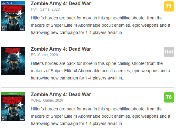 由《狙击精英4》制作人推出的系列射击新作《僵尸部队4:亡灵大战》即将于北京时间2月5日正式发售,登陆PS4、Xbox One和PC(Epic)平台,今日(2月4日)IGN也放出了对该作的评测,这款二战背景的射击游戏得分为7分,IGN还同步公开了该作开局15分钟的实机演示片段。 IGN 7分:尽管《僵尸部队4》玩起来让人感觉和《求生之路》有着很大的相似感,但却没有失去它自有的良好射击手感,和它那复古式的游戏方式:射杀纳粹僵尸。凭借其多样化的战役故事模式,玩家有着大量的机会去体验团队合作和血腥又令人作呕的枪林弹雨。不过该作的武器升级系统似乎没有太大的必要,可玩性没有预期的那么高。 《僵尸部队4》开局演示: 目前《僵尸部队4》在M站的媒体均分为71分(PS4版)和76分(Xbox One版): 游戏简介:《僵尸部队4:亡灵大战》是一款由《狙击精英4》幕后制作人推出的令人毛骨茸然的射击游戏,希特勒的僵尸群又回来耍阴谋了!可恶的超自然敌人、非凡武器和全新1-4人恐怖战役正在20世纪40年代的欧洲翘首以待,你要为了从亡灵大决战中拯救人类而奋战! |