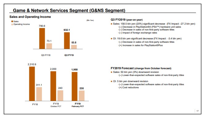 今天(2月4日)Sony 公开了2019~2020财年第三季度财务报告,据财务报告显示 Sony 19~20财年第三季度的销售收入为2.463万亿日元,同比上涨3%;营业收入为3001亿日元,同比下降20%。另外从游戏业务来看,无论是从销售额还是收入来看均同比下降,但是 PS+ 的订阅用户量仍在稳步上升 (数据均截止至2019年12月31日) Sony 官方在财报的【游戏与网络服务】部分中写道,2020财年第三季度 Sony 的销售额同比下降了1585亿日元降幅达到了20%,Sony 将此次下滑归结于 PS4 主机硬件销量的下滑以及非第一方游戏销量的下降,以及汇率的波动;从营业收入来看,Sony 游戏业营业收入下降了196亿日元,这同样是由于非第一方游戏销量的下降,不过值得庆贺的是 PS+ 订阅服务的用户量仍在稳步增长。 与此同时,由于比预期更少的非第一方游戏销量,Sony 也再次下调了对公司19~20财年的游戏业收入预期。 此外,PS4 主机的销量已经突破了1.089亿份,该主机在2019年最后季度的出货量为610万台低于去年的810万台,生命周期正在逐步走向终点;PlayStation Plus 订阅用户总数也突破了3880万人次,这也意味着有大约37%的 PS4 用户订阅了 PS+。 |