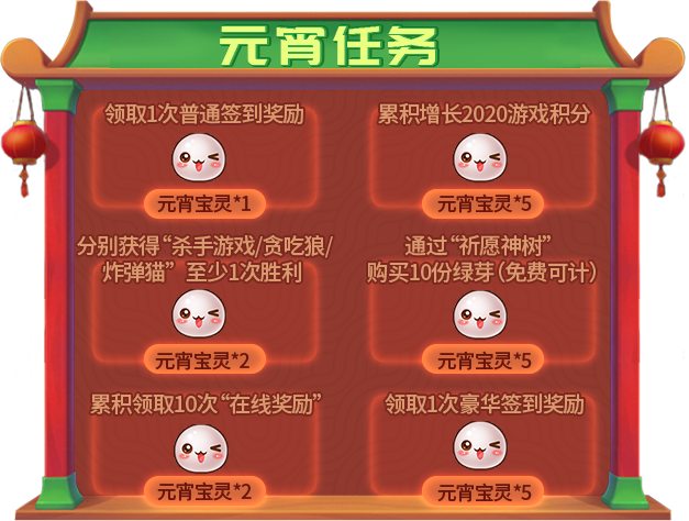 张灯结彩的元宵节,正是一年里春回大地的时刻!这里有热闹多趣的花会,推理之都的小伙伴们穿梭在城市的大街小巷里,可尽情地赏月、猜灯谜,或者为最爱的人祈福。在这新的一年里,健康是福,平安是福,快乐才是福!值此“福气满满”之际,《推理学院》可不会忘记为大家献上丰厚的礼物——2020年元宵节活动,缤纷开启! 活动时间:2020年2月7日14:00-2月9日23:59 活动一:元宵任务,宝灵献礼 游荡在夜空中的洁白光点,正是“元宵节特别信使”!快瞧瞧它们带来了什么礼物吧! 活动期间,来自推理之都的元宵节任务发布啦!完成指定任务,获取“元宵宝灵”,领取丰厚奖励! 元宵任务: 活动奖励: 活动规则: 1. 活动期间,每种“元宵任务”只能完成一次; 2. “杀手游戏”任务需在12人及以上场次中完成,“贪吃狼/炸弹猫”需在5人及以上场次中完成; 3. 在活动结束后,玩家剩余的每一份 “元宵宝灵”都将被自动兑换为“10游戏积分”,并发放至玩家账户。 活动二:幸运连连,惊喜福袋 你会在什么情况下许愿呢?当流星划过天际,当他送你一株四叶草,又或者当你收下了一个惊喜福袋! 活动期间,惊喜福袋加入商城出售并开启限时折扣(折后价142金币)!玩家每接收1个非绑定“惊喜福袋”即可获取1颗“幸运星”!带上“幸运星”,来参与奖品兑换吧: 活动规则: 1. 接收绑定的惊喜福袋不会获得“幸运星”; 2. 在活动结束后,每一颗未及时兑换的“幸运星”将自动兑换为18游戏积分,并发放至玩家账户。 活动三:元宵灯谜,等你揭晓 这是元宵节必不可少的环节——猜灯谜!每一位成功猜出谜底的小伙伴,都可以获得一份特别奖励哦!而且据说最聪明的玩家还有额外的超级大奖! 活动期间,每天都有一道谜题等你解密!通过活动中给出的线索,您需要破解《推理学院》为您准备的谜题。快来破解答案吧!只要您的答案正确,就可以领取一份“元宵礼包”,除此之外,每天首次回答正确的玩家还能够获得“金砖”一份哦! 元宵礼包: 活动规则: 1. 仅限700积分及以上玩家参与; 2. “元宵发言框”是元宵节限定装扮 3. 在每日的答案验证中,您最多输入3次答案,如果3次答案均错误,则当日无法再验证答案。 活动四:彩灯冒险,新春启程 在一块背面朝上的九宫格中,藏有3颗炸弹,而其余的方块中全是充满惊喜的奖励! 活动期间,每次决定开启寻宝之旅时,只需花费3000游戏币就能加入其中!相信你的直觉,点开一个方块吧!我可以为你好好保存你所有翻开的奖励,在你决定结束这一局的时候可以全部领走它们,但如果你一旦翻到炸弹,这些所有奖励都会消失! 每一局探索只需一次性支付3000游戏币,直到你领取奖励或者翻到炸弹。在那之后,九宫格将会重置,等待下一位探索宝藏的幸运冒险家! 元宵奖励: 每局探索累计从九宫格中获得3/4/5/6份奖励时,你还能获得额外的奖励,并且额外奖励能累积增加! 每局累计获得3份奖励:额外随机赠送一份:爆竹、拐杖糖、彩虹泡泡 每局累计获得4份奖励:额外随机赠送一份:祈福宝袋、惊喜福袋、火鸡 每局累计获得5份奖励:额外随机赠送一份:泰坦尼克号、舞狮、爱吻卡 每局累计获得6份奖励:额外赠送一份:金砖 元宵的馈赠: 当然,你绝对不会空手而归——每踩到一个炸弹,就会获得一份讨好道具“元宵”,接收“元宵”后会增加1游戏积分,并累积道具勋章。 活动五:浪漫天鹅,热闹起舞 就在精彩的元宵活动华丽登场的时候,优雅的黑白天鹅再次回归! 活动期间,每使用50绿芽可参与1次抽奖,有机会获得“黑天鹅”与“白天鹅”礼服! 白天鹅抽奖池: 黑天鹅抽奖池: 活动规则: 1. 如果连续99次没有抽到“黑/白天鹅礼服”,则第100次抽奖会直接获得“黑/白天鹅礼服”; 2. 为保证玩家能顺利抽到属于自己性别的服装,在参与抽奖时,不会抽到与自己性别不符的“黑/白天鹅礼服”; 3. “黑/白天鹅礼服”非绑定,可结婚、进行交易和回收,不可续期。 活动六:限时冲级,金榜题名 精彩刺激的“冲级活动”再次打响,代表各个等级区参战的小伙伴们,到底谁会捧走专属奖励呢,让我们拭目以待! 活动期间,点击“参与”即可记录玩家专属等级区——等级区为以下10个:太阳以下;太阳;牌子;帽子;皇冠;白蝶;彩蝶;黑蝶;金蝶;金蝶以上。 在活动结束后,各个等级区积分增长最多的玩家,将成为10位获胜玩家之一,并分别从“服装奖励”和“宠物奖励”中各挑选一种获得: 活动规则: 1. “服装奖励”仅展示与自己性别匹配的服装; 2. “限时冲级排行榜”积分统计截至2020年2月9日23:59:59; 3. 所有奖励均为非绑定,可进行交易和回收,但不可续期。 热闹元宵,快乐新春!《推理学院》祝大家节日快乐,身体健康,游戏愉快!《推理学院》是一款寓教于乐的休闲游戏,能帮助你提高观察能力、逻辑思维能力、想象力、判断力、表述能力、心理素质和表演能力;同时也可以培养您的团队精神、活跃团体气氛、增进团队成员的感情交流、提高凝聚力。是目前线上最大的杀人游戏,丰富的角色设定和多样游戏版本,带给玩家最完善的杀人游戏体验。 |