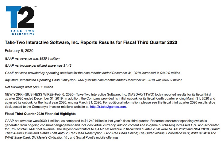 今天(2月7日)美国游戏厂商 Take-2 公开了2020财年第三季度财务报告,财报数据显示 Take-2 在本财年第三季度 GAAP 净收入为9.301亿美元,较去年同期的12.5亿美元下降了25%。GAAP 每股净收益为1.43美元,低于上年同期的1.57美元。Take-2 官方也列举出了在本季度中贡献最大的游戏作品,它们分别是《NBA 2K20》《NBA 2019》《GTA V/Online》《荒野大镖客:救赎 2》《外部世界》《无主之地 3》以及《WWE 2K20》等游戏。 此外值得一提的是,在【有业务与产品亮点】的“2K”部分中,Take-2 特别讲到了此前宣布由新工作室 Cloud Chamber 开发的《生化奇兵》系列全新作品,确认《生化奇兵》新作还需要数年时间才能够开发完成。 R星推出的《荒野大镖客:救赎 2》也成为了系列第一登上 PC 平台的作品,借由 PC 版的热卖《荒野大镖客:救赎 2》出货量已经突破l了2900 万套;老牌人气大作《GTA V》出货量更是超过了1.2亿份。 2019年12月我们曾报道过(资讯链接),2K 成立了名为 Cloud Chamber 的新工作室,本工作室将开始致力于全球知名的《生化奇兵》系列的下一次迭代,该系列将在未来几年内开发。 |