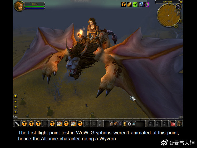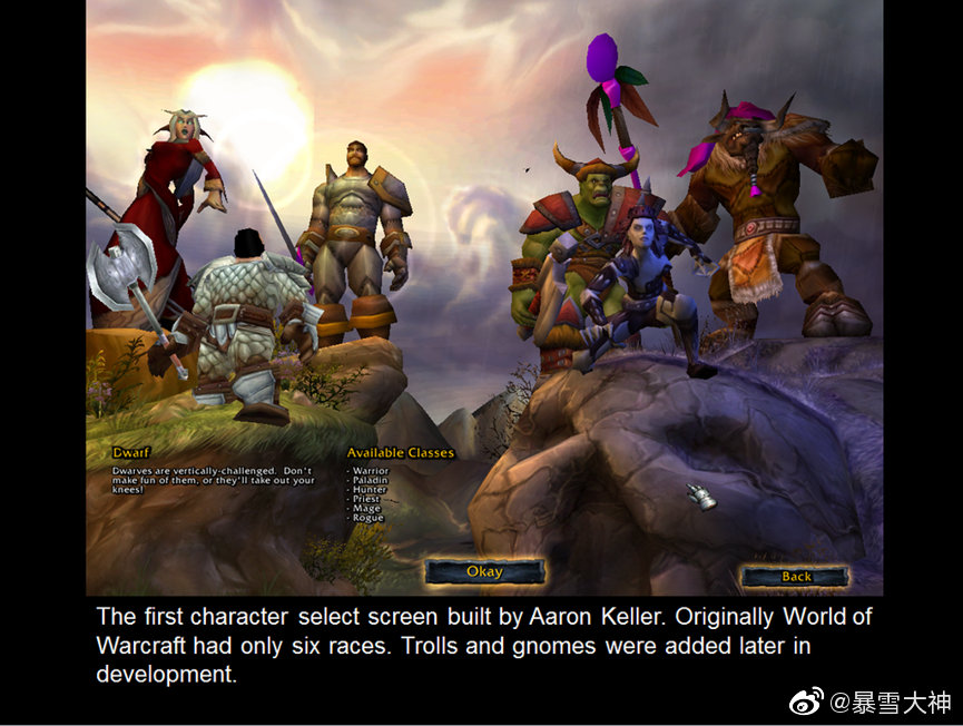 暴雪大神官微刚刚分享了《魔兽世界》早期开发图,向新玩家介绍了1999年的《魔兽世界》到底是什么样子。 1.当时的选择角色界面,可见联盟和部落都只有三个主体种族,侏儒和巨魔都还未加入进来。 2.任务进程,是不是很有魔兽争霸的风范呢? 3.一张双足飞龙飘过莫高雷的画面,可见背上的还是一个人类女性。 4.当时的人物界面还很像自己的另外一款招牌游戏:暗黑破坏神。 5.前往暴风城! 6.测试晚期,血色修道院门口的宣传画。 |