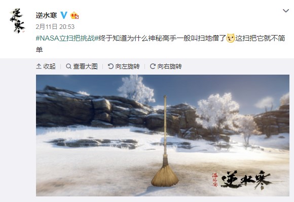 不知道是谁造的谣,声称NASA说只有2月11日这天能立扫把,是因为地球完美的重力角度。一时间在家闲得发慌的网友们仿佛找到了乐趣,立扫把的照片在社交平台上疯狂刷屏,引发全民狂欢。 这股立扫把的风潮也席卷到了游戏圈,最爱蹭热度的网游《逆水寒》果然在第一时间就放出出在游戏里立起来的扫把,被形容为“这不是靠重力,是靠内力!”的调侃,也在一时间激起了玩家的恶搞之魂,纷纷脑洞大开在游戏里玩起了“万物皆可立”的挑战赛。 扫把倒立还不够,还要橘子凑 有玩家做出了立扫把的进阶版,只立在地板上有什么了不起?先放两个橘子,再把扫把倒立起来,这没有十年的功力基本完成不了啊! 站20米高空进行单手倒立 相传关七盟主最擅长的就是单手倒立,现在有玩家也站在汴京的建筑物上,单手倒立在20米的高空,看起来有些提心吊胆,生怕一不小心摔下来。 锅碗瓢盆都来了 下面这位玩家带来的挑战作品,咋一看都特别的务实。直立的锄头上面又立了一个锅铲,而锅铲上还能立个锅?!有需要的时候拉下来就可以炒一桌菜了! 扇子三兄弟也不甘示弱 有务实派的玩家,也有文艺青年带着自家的扇子来进行挑战。底下两把扇子靠着扇柄就能直立已经很厉害了,而这把折扇靠着诡异的角度,用扇尖撑起了扇子的重量。 学院派玩家的毛笔 文艺青年不止有玩扇子的,还有玩毛笔的。这位玩家可能是假期练了太多的字,竟然想到用毛笔摆出这个“毛笔阵”,看起来和河里的莲花有点相得益彰了。 动物也来凑热闹 这位玩家更是出奇制胜,竟然想要讲宝贝坐骑玉生烟拿来玩倒立,纤细的鹿角支撑着鹿的身躯,上面还停了一只正在休憩的仙鹤。这强大的脑洞和奇葩的行动力,真是令许多网友叹为观止。 看完了这么多神奇的“万物皆可立”的玩家参赛作品,只能感叹逆水寒这个游戏真是从官方到玩家,都有着一颗热爱恶搞的心。 对此,逆水寒玩家们傲娇的表示:“不是恶搞,只是我们习武之人,自然有内力啦!” |