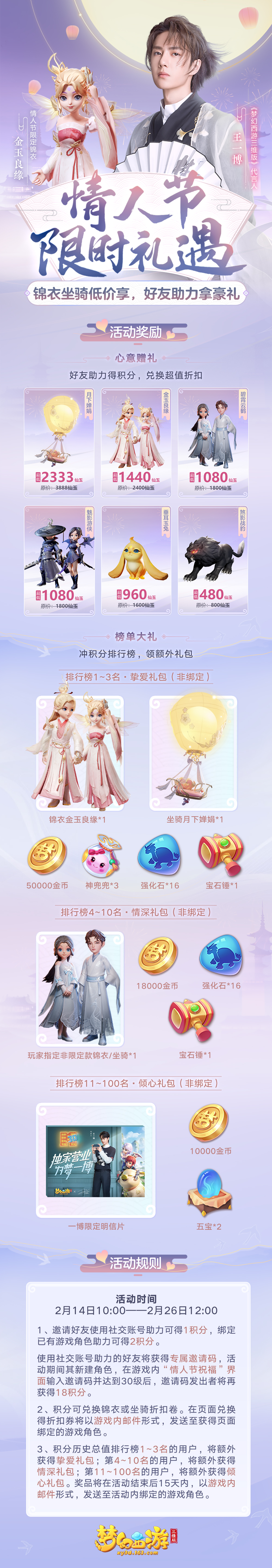 2月是一个充满甜味的月份,前有2020年2月2日这个千载难逢的“爱你爱你”爱情纪念日,后有2月14日、元宵节等中西方情人节,只可惜疫情当前,恋人们或许不能够像往常一样相聚在一起(在抗击疫情的日子里,大家务必记得勤洗手、戴口罩、少出门、少聚会),不过俗语有云“网络一线牵,珍稀这段缘”,《梦幻西游三维版》手游新服“金玉良缘”即将在2月14日开启,有缘人们不妨来《梦幻西游三维版》度过一个别样而不失浪漫的情人节,线上结缘,甜蜜不减! 当然,穿上情侣套装肯定更加抢眼。限定珍稀情人节锦衣“金玉良缘”正式上线,少侠们可以携手结缘对象,换上甜蜜的情侣装,在三界洒下满满狗粮。 “在天愿作比翼鸟,在地愿为连理枝。”千古佳句给了开花组设计灵感。在白、粉色为基调的绸缎上加入灿金色羽毛装饰,让穿上“金玉良缘”的三界情缘们,仿若化身比翼鸟。 听说,情人节限定锦衣和情人节烟花“缘定三生”更配哦。 而这甜蜜浪漫的锦衣,如今竟然可以免费抱走!手机登录 https://url.163.com/9WK ,邀请好友助力或助力好友获得积分,即可免费兑换包括情人节锦衣在内的各项折扣券,甚至免费领取珍稀道具! 此外,《梦幻西游三维版》新春抖音挑战赛也于今日落下帷幕,本次新春游戏定制主题妆容“梦幻鼠年开运妆”备受少侠们喜爱,话题下视频投稿数近95万份,播放量已超过8亿次,该话题下视频互动总量达2000万!那么被誉为“春节最火妆容挑战赛”到底有何魔力?接下来让我们一起来欣赏一下少侠们的“精彩表演”吧。 借此良辰佳节,《梦幻西游三维版》祝愿天下有情人终成眷属,玩家朋友们阖家幸福安康! 关于《梦幻西游三维版》手游: 《梦幻西游三维版》是由网易梦幻西游金牌团队研发的次世代3D即时制手游,延续了梦幻西游的经典玩法、独特的国风美学,并塑造了一个万物有灵的西游大世界:随心选择的善恶身份、自由结交的仙魔精怪、无定式的剧情发展、开放探索的游戏规则……即刻启程,触摸三界的心跳。 |