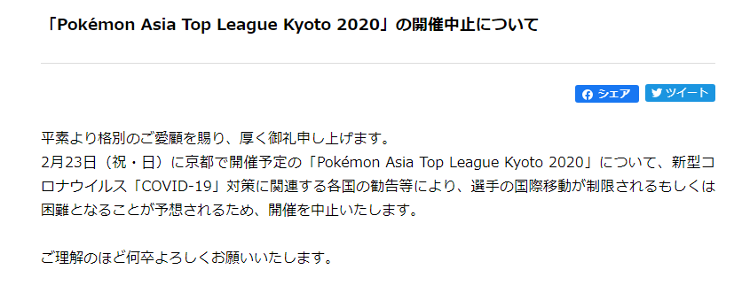 宝可梦社近日宣布,原计划于2月23日举行的宝可梦卡片游戏官方亚洲大会《Poke?mon Asia Top League Kyoto 2020》确定取消,原因是由于新型肺炎的影响。 ·《Poke?mon Asia Top League Kyoto 2020》本年度已经有日、韩、印尼、台湾、香港6个亚洲地区报名参赛,预定2月23日在京都举行,如今由于新型肺炎《COVID-19》的影响而确定取消。 |