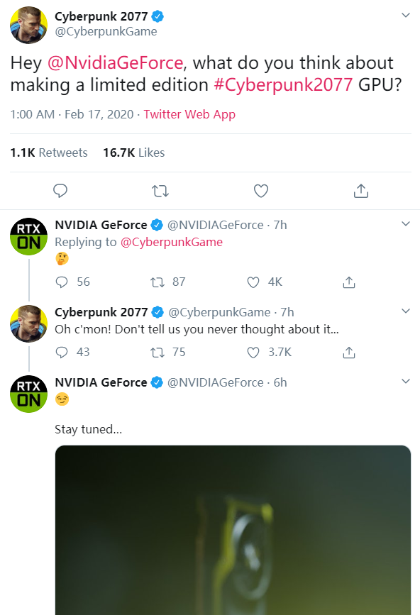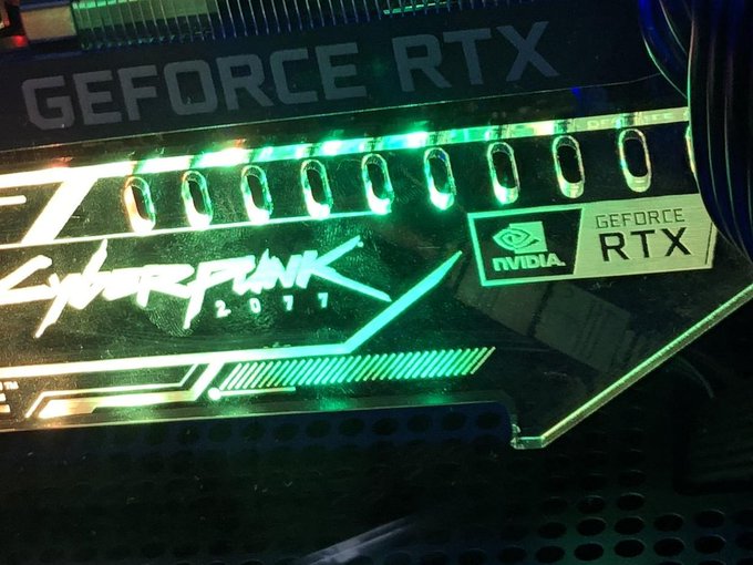 今日《赛博朋克2077》官推主动@NVIDIA官推,建议制作一个《赛博朋克2077》主题的限量版GPU。随后NVIDIA官推加入了互动,最后放出了一张模糊的渲染图,暗示确有其事。 《赛博朋克2077》采用升级版RED引擎(RED 4)打造,PC版支持RTX光追(用于游戏中的环境光遮蔽和漫射照明)。此前CDPR曾表示采用新引擎打造的《赛博朋克2077》总会有让玩家不断惊叹的时刻,他们还没有真正展示游戏的即时全局光照。 目前CDPR尚未公布《赛博朋克2077》的PC版配置以及开启光追需要的PC配置,但想必肯定不会低了。 国外网友分享的自制2077主题GPU |