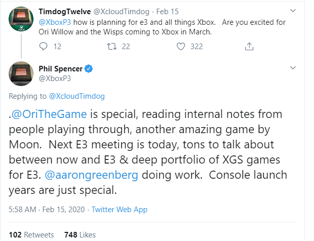 根据外媒GameSpot报道,Xbox总监菲尔·斯宾塞(Phil Spencer)最近在社交媒体上分享了一些Xbox的E3 2020展前发布会的相关计划。 菲尔·斯宾塞近日通过推特回答了网友的提问。斯宾塞透露说,微软在2月15日举行了E3计划会议,会议上探讨了将会亮相E3游戏展的Xbox游戏工作室作品“深度组合(deep portfolio)”,不过斯宾塞并未透露具体的作品名称。 斯宾塞还在推特上提到“新主机发售的年份是非常特别的”,意指今年晚些时候将会发售的Xbox Series X主机,看样子Xbox也为新主机做了不少的准备,应该会为大家带来大惊喜。 另外,菲尔·斯宾塞也表示,Xbox市场部总监、业界老兵Aaron Greenberg将会领导E3计划团队。Greenberg目前并未分享有关E3 2020计划的相关细节,此前他仅在推文中预告过Xbox可能会与美国餐饮品牌Taco Bell进行合作。 |