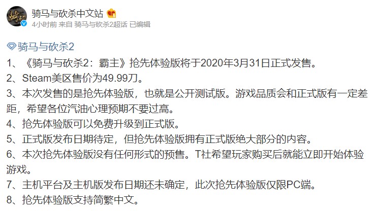 更新:@骑马与砍杀官方微博对于本次抢先体验内容进行了报道。 1、《骑马与砍杀2:霸主》抢先体验版将于2020年3月31日正式发售。 2、Steam美区售价为49.99刀。 3、本次发售的是抢先体验版,也就是公开测试版。游戏品质会和正式版有一定差距,希望各位汽油心理预期不要过高。 4、抢先体验版可以免费升级到正式版。 5、正式版发布日期待定,但抢先体验版拥有正式版绝大部分的内容。 6、本次抢先体验版没有任何形式的预售。T社希望玩家购买后就能立即开始体验游戏。 7、主机平台及主机版发布日期还未确定,此次抢先体验版仅限PC端。 8、抢先体验版支持简繁中文。 之前的内容: 长期以来一直没能确定发售日期的《骑马与砍杀2:霸主》今天(20日)凌晨在STEAM平台宣布了抢先体验日期。3月31日起,期待本作多年的粉丝们终于可以在STEAM平台购买并抢先游玩尚未开发完毕的版本。 根据STEAM《骑马与砍杀2:霸主》社区通知显示,该游戏在全球各区的售价为49.99美元、49.99欧元和39.99英磅,国区价格尚未确认。另外,STEAM页面显示该游戏不支持简体中文。 《骑马与砍杀2:霸主》是一款中世纪战斗模拟游戏,也是《骑马与砍杀:战团》备受期待的续作。本作的故事发生在200年前,对详尽的战斗系统和卡拉迪亚世界进行了扩展。你可以用攻城器械轰炸山间要塞,在城市的小巷里建立秘密的犯罪帝国,还可以为了争夺权力而在混乱的战场上厮杀。 |