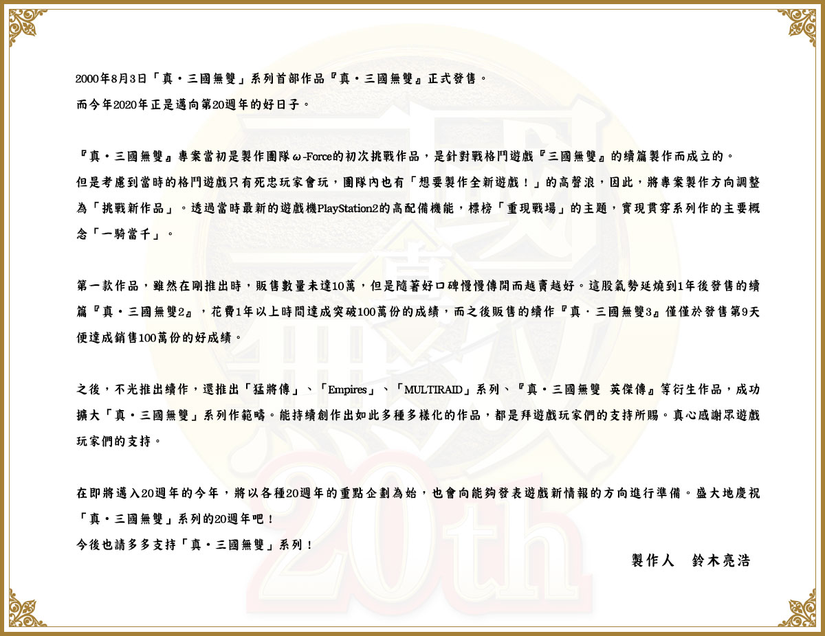 今日(2月20日),光荣特库摩官方宣布《真三国无双》20周年网站正式上线,官方表示:托玩家们的福,《真三国无双》如今迎来了20周年的好日子。为了此次20周年网站的正式上线,官方还公开了一段纪念寄语。 官方原文: 官方表示:“2000年8月3日发售的第1作《真?三国无双》为「无双」系列作品的原点,玩家可在战场中横扫千军,体验“一骑当千的爽快感”。其后,也有许多「真?三国无双」系列续作及衍生作品问世,系列作全球累积销售量已超越2,100万。 今后也将进行20周年纪念直播,以及发表系列相关新作等各项纪念企划,盛大欢庆系列20周年,敬请期待。” 此外,官方还在《真三国无双》20周年网站上公开了历代作品的时间轨迹,感兴趣的玩家可以点击此链接查看更多资讯。 |
