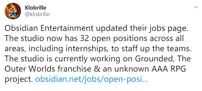 之前我们曾经报道过,黑曜石除了正在制作的新作《Grounded》之外还有一款神秘新作。近日,据知名爆料大神Klobrille在推特上公布的消息黑曜石正在为自家一款未公布的新3A RPG游戏招人。 知名爆料大神Klobrille在推特上表示,黑曜石娱乐更新了他们的招牌页面。目前黑曜石已经有了32个开放招聘的工作岗位涉及了各个领域,包括实习生。黑曜石现在正在打造新作《Grounded》,《天外世界》系列作品和一款未知3A RPG游戏。 此前的消息称,黑曜石的未知新作可能会是《天外世界》的续作,但是目前看来,除了《天外世界》系列作品(但是没有明确说是续作)之外,黑曜石还在打造一款新的3A RPG游戏,估计还会是一款跨世代游戏。 |