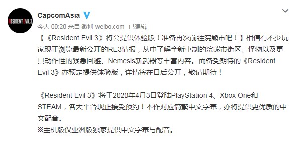 今日(2月26日)CapcomAsia官方微博宣布,《生化危机3:重制版》将提供体验版,详情将在日后公开,敬请期待。该作将于4月3日发售,官方应该会尽快公布体验版的。CapcomAsia还表示游戏有简繁中文字幕,还将提供优质的中文配音。主机版只有亚洲版独家提供中文字幕与配音。 国外几家媒体也公布了《生化危机3:重制版》实机演示视频,展示游戏全方面的进化。一起来欣赏下视频吧! 实机演示: 官方微博原文: 相信有不少玩家现正浏览最新公开的RE3情报,从中了解全新重制的浣熊市街区、怪物以及更具动作性的紧急回避、Nemesis新武器等丰富内容。而备受期待的《生化危机3:重制版》亦预定提供体验版,详情将在日后公开,敬请期待! 《生化危机3:重制版》将于2020年4月3日登陆PS4、Xbox One和STEAM,各大平台现正接受预约!本作对应简繁中文字幕,亦将提供更优质的中文配音。主机版仅亚洲版独家提供中文字幕与配音。 设定图赏: |