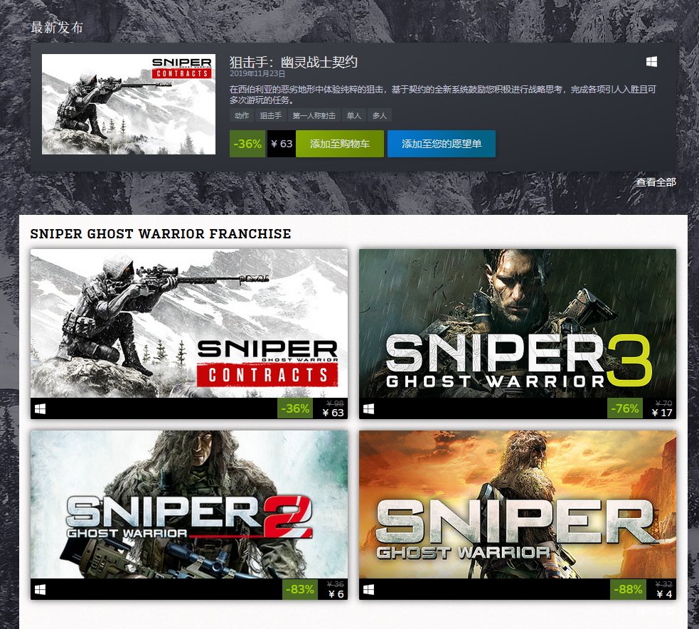 CI发行商特卖:Steam《狙击手幽灵战士契约》63元新史低