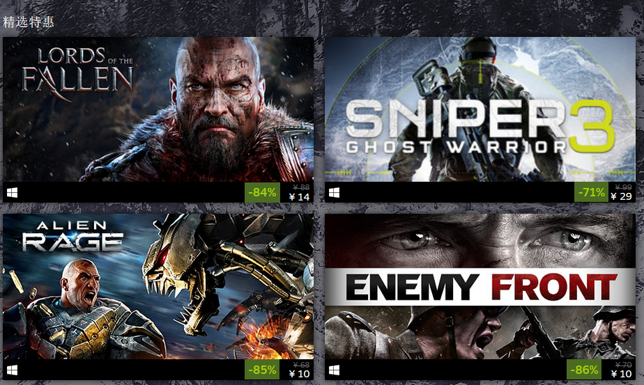 根据Steam商城页面公开的新消息,目前CIGAMES 发行商已经发起了一波特卖,其中《狙击手:幽灵战士》系列有不少优惠,以下为官方公开的促销活动细节。 从此次特卖活动详情来看,此次《狙击手:幽灵战士契约》的折扣力度为“-36%”,售价63元(新史低价),《狙击手:幽灵战士3》折扣力度为“-76%”,售价17元(新史低价),《狙击手:幽灵战士2》折扣力度为“-83%”,售价6元(非史低价)。 此外,《堕落之王(Lords Of The Fallen?)》年度版折扣力度为“-84%”,售价14 元(非史低价),《异形之怒(Alien Rage - Unlimited)》折扣力度为“-85%”,售价10元(非史低价),《敌军前线(Enemy Front)》折扣力度为“-86%”,售价10元(非史低价)。 此次《狙击手:幽灵战士》系列有不少优惠价,感兴趣的玩家查看详情。 |