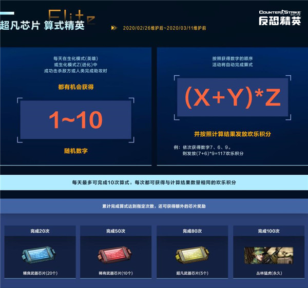2月26日,《反恐精英Online》春季全新版本即将到来。狗年神器憾宇碎星(永久)限时3倍爆率入库密码箱。参与算式精英活动,赢取海量欢乐积分和芯片好礼。还有随机规则生化模式,让你畅享不一样的生化。赶快一同来关注吧! 撼宇碎星 年神再临 如果说《反恐精英Online》中哪款武器可以被称为常青树,相信很多玩家都会想到狗年神器憾宇碎星。作为2018年春节上线的装备类武器,憾宇碎星即使在两年后的今天也依然稳稳跻身于一线武器的行列中,无论生化还是灾变模式都有着上佳的表现。 2月26日至3月11日期间,憾宇碎星将限时入库密码箱,而且是3倍爆率哦!只要使用[无限超凡武器芯片]或[超凡武器芯片]破译密码箱,均有机会永久获取这款狗年神器。如果你手上尚缺一把高伤害的输出型主武器的话,那么这个好机会可千万不要错过哦! 超凡芯片 算式精英 算式精英特别活动来啦,大量欢乐积分等你前来获取。2月26日至3月11日,活动期间内,每天在生化模式(英雄)或生化模式Z(进化)中成功击杀敌方或人类完成助攻时,都有机会获得数字(随机1~10),按照获得数字的顺序,活动将自动完成算式(X+Y)*Z并按照计算结果发放欢乐积分。例如依次获得的数字为7、6、9的话,则可以对应获得(7+6)*9=117欢乐积分。每天最多可完成10次算式,每次都可获得与计算结果数量相同的欢乐积分,累计完成算式达到指定次数,还可获得额外的芯片奖励和丛林猛虎(永久)哦! 随机规则 生化英雄 2月26日至3月11日,深受玩家喜爱的随机规则生化英雄模式又来啦!活动地图中进行游戏,每回合都会随机适用1种有趣的规则。玩家可变身炎魔?最后一发子弹伤害巨幅增加?僵尸技能无CD?只要你来玩,这些看似荒诞的事情在游戏中都有可能发生哦! 以上便是《反恐精英Online》2月26日的主要更新内容了,当然了,游戏中还为玩家准备了丰富的战场补给奖励,以及为新玩家和回归玩家准备的特别福利哦!赶快到游戏中看看吧! 2月26日 |