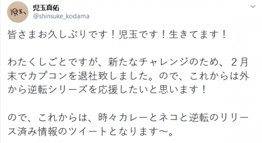 《逆转裁判》系列制作人児玉真佑宣布从卡普空离职