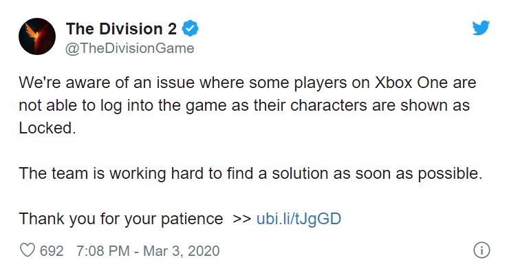 育碧的《全境封锁2》在3美元超级特惠之后,近日,新的DLC“纽约军阀”也正式上线了, 新的DLC将为游戏带来许多新内容。这对于能够体验它的玩家来说非常棒,可是即使购买了新DLC的许多人仍无法体验游戏新内容。 《全境封锁2》新的DLC“纽约军阀”上线之后,BUG不断,让PC和Xbox One的玩家都很难尝试游戏中的新内容,尤其是对于Xbox One玩家来说,很多玩家向育碧投诉,表示在新的DLC“纽约军阀”上线之后,这些玩家登陆游戏之后发现他们的角色无缘无故地被锁定无法使用。 育碧表示已经意识到了这个问题,并且正在调查可能导致该错误的原因,并且还在推特中做出了回复。育碧表示,我们已经知道Xbox One的玩家登陆游戏之后他们的角色显示被锁定,我们的团队正在积极找出解决方法,谢谢大家的耐心等待。 |