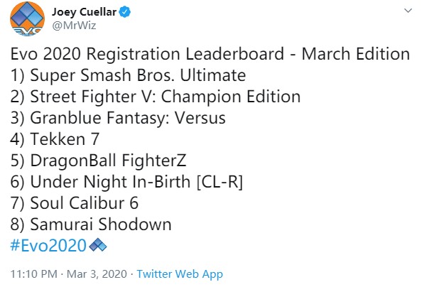 EVO 2020游戏报名人数排行 《任天堂大乱斗》第一