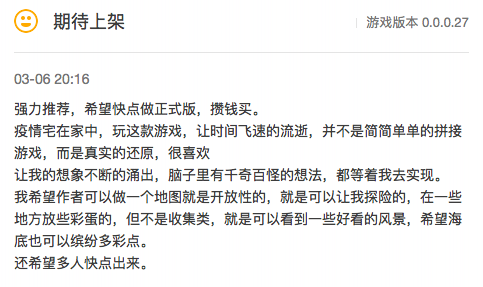 近期,基于物理模拟的海面建造游戏《沉浮》在wegame测试区开启了首轮测试。从3月5日10点上线测试区至3月8日18点,短短4天时间就领完了超万个测试资格,更是获得了玩家们好评连连,评测区期待度达99%! 作为一款以真实物理搭建为核心的海上沙盒游戏,《沉浮》以极高的搭建自由度和超真实的海洋画面让玩家大呼惊喜。在游戏中,玩家们不仅可以利用游戏内提供的道具,尽情发挥想象力搭建出自己独一无二的战舰,也可以利用它进行有趣的冒险闯关。 而游戏中逼真的物理效果和多样的模块功能更是让玩家们脑洞大开,战舰飞机无所不造,更有不少大神玩家已经开始了创作大比拼! 在这次测试中,玩家们也给出了许多有价值的测评。不少玩家认为,《沉浮》的搭建系统非常给力,可以满足玩家们的很多的物理幻想。除此之外,《沉浮》优美的画质和逼真的音效,也给玩家们带来了很棒的游戏体验,更有玩家表示,光看看优美海景就可以发呆一整天,所以凭画质圈粉的游戏,《沉浮》必须有姓名! 下周持续到3月19日,《沉浮》还将持续在WeGame测试区发放测试资格,每天上午10:00记得及时抢码哦!一起来体验海上建造的乐趣吧~ |
