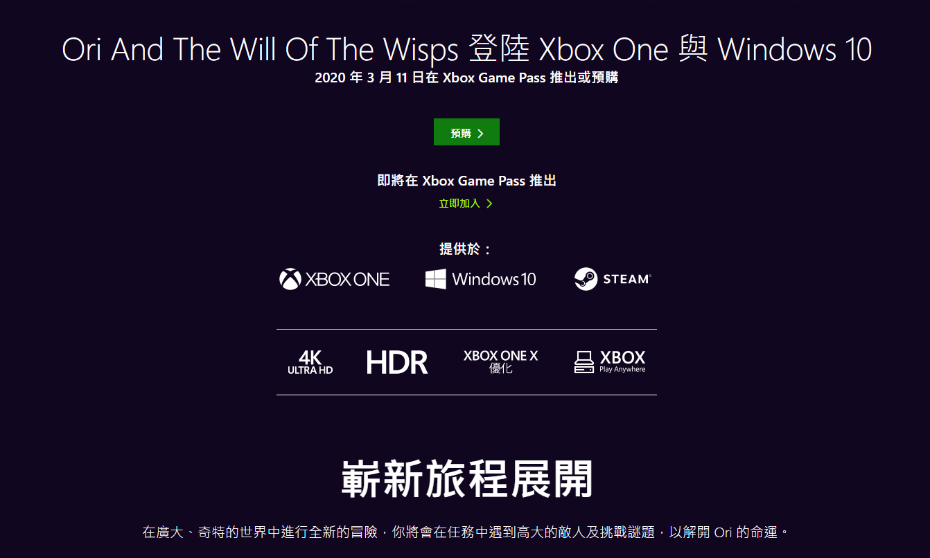 外媒GameSpot释出了《奥日与萤火意志》PC版最新一段12分钟演示视频,展示了游戏中的探索和Boss战。本作自带中文,将于3月11日发售,登陆PC、Xbox One,首发还会加入Xbox Game Pass。 PC版演示: 让自己沉浸在手绘故事的冒险体验中 在这个扣人心弦、引人入胜的故事冒险及动听的配乐中,揭开奥日真正的命运。探索广大、奇特又出奇美丽的环境。 掌握新技能 利用新得到的精灵武器、咒语和攻击,带领奥日走过未知危险的旅程。运用全新的碎片系统,加强奥日新发现的能力,并自订专属的游戏风格。 面临史诗般的敌人和具挑战性的谜题 巨大的大魔王 – 面对强大的敌人和惊险刺激的逃生结果。新角色 - 向开朗性格的新角色寻求支援,他将协助你揭开奥日神秘的命运。 体验全新的刺激模式 精灵试验 - 经过游戏中独特的急速赛跑挑战,冲向排行榜第一名。精灵神殿 – 在限时试验中面对挑战度逐渐提高的敌人们,以收集奖励。 视频画面: |