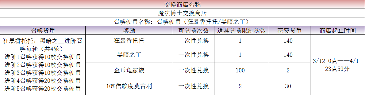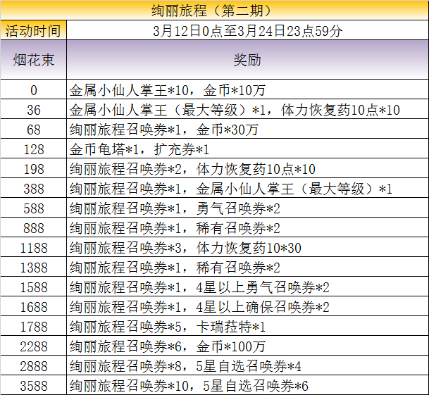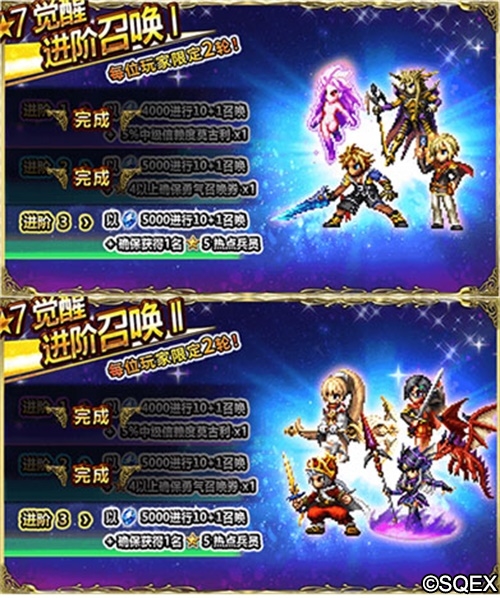3月12日起,《最终幻想:勇气启示录》(下称FFBE)将会开启一系列特殊的主题活动,风格独特的黑暗之王x狂暴香托托卡池解锁,第二批七星觉醒兵员开放,以及各种各样的福利活动等待着各位队长前来参加。 以下为活动详情: 新活动 1.莫古利王活动-露?艾比塔乌神殿 二.新召唤卡池活动 活动期间,稀有兵员[狂暴香托托]、[黑暗之王]、[乔吉姆]、[库皮皮]已经踏上了水晶冒险的旅途,出现几率将会提升,幻兵队长们赶快召唤他们加入冒险队伍吧!同时也开放了狂暴香托托,黑暗之王5星确保20%召唤活动,一发出货不是梦想! 玩家们限定召唤3轮,每轮可召唤5次,每1次召唤玩家们都会获得指定的稀有奖励: —进阶1——10+1次召唤+附送?1张5确保(20%精选)召唤券*1、交换硬币*10 —进阶2——10+1次召唤+附送?1张5确保(20%精选)召唤券*1、交换硬币*10 —进阶3——10+1次召唤+确保获得1名5星兵员、交换硬币*10 —进阶4——10+1次召唤+附送1张5确保(20%精选)召唤券*1、交换硬币*20 —进阶5——10+1次召唤+确保获得[狂暴香托托]、[黑暗之王]其中之一+交换硬币*20 3.魔法博士交换商店 5.7星觉醒进阶召唤第二批I:艾斯、皇帝、提达、入神蒂娜 活动期间,第二批稀有兵员[入神蒂娜]、[皇帝]、[艾斯]、[提达]、 [洋葱剑士]、[彩花]、[葵因]、[蕾贝尔塔]开放 7星觉醒,进阶召唤活动限时启动。 玩家们限定召唤2轮,每轮可召唤3次,每1次召唤玩家们都会获得指定的稀有奖励: 7.绚丽旅程第二期活动 绚丽旅程第二期活动启动,队长们可以凭借绚丽旅程召唤券:确保召唤出宝石*500,还有几率获得钻石*6600、★5以上确保勇气召唤券奖励,防身罐、魔力罐、体力恢复药、信赖度莫古利、勇气召唤券、金属小仙人掌王(最大等级)、金币龟塔。 三.连续登录活动 莫古利王兑换币(褪色的水晶)*2000;宝石*1000;?4以上确保勇气召唤券*1;莫古利王兑换币(褪色的水晶)*2000;宝石*1000;10+1召唤券*1;宝石*1000; 四.商店礼包 商店内上架了多个福利礼包: 商城新礼包-新时代庆典宝箱:宝石*18000,宝石召唤券*6,金属小仙人掌王MAX*5 商城新礼包-新时代盛典宝箱:宝石*23000,金币龟塔*2,金属小仙人掌王MAX*8 商城新礼包-屠龙魔棒宝箱:宝石*7000,屠龙刺荆*1,宝石召唤券*2,10%信赖度莫古利*1,体力恢复药10*10 商城新礼包-以太魔力宝箱:宝石*16000、透器以太?雷萨*1,10%信赖度莫古利*1,4星以上确保召唤券*2,金属小仙人掌王*20 商城新礼包-潜藏魔力宝箱:宝石*7000,潜在魔力*1,宝石召唤券*2,金属小仙人掌王MAX*1,体力恢复药10*10 商城新礼包-魔法博士召唤宝箱:宝石*10000,宝石召唤券*6,勇气召唤券*10,体力恢复药10*30 商城新礼包-百闪之力宝箱:高速突击*1,宝石召唤券*6 商城新礼包-魔法博士旅途宝箱:宝石*5000,宝石召唤券*4,10%信赖度莫古利*1,体力恢复药10*20 商城新礼包-资源补给礼包:宝石*1000,宝石召唤券*3,金属小仙人掌王MAX*1,体力恢复药10*10 商城新礼包-魔法博士之术宝箱:宝石*500,宝石召唤券*1,金属小仙人掌王MAX*1,体力恢复药10*20 商城新礼包-魔法博士奖赏礼包:勇气召唤券*2,金币龟家族*2,金属小仙人掌王*2,体力恢复药10*10 商城新礼包-宝石召唤奖励礼包:宝石召唤券*1,扩充券*1,体力恢复药10*10 商城新礼包-觉醒大晶石I礼包:防御大晶石*20、治愈大晶石*20、支援大晶石*20、技巧大晶石*20、金币龟家族*2,金币*50000,体力恢复药10*10 商城新礼包-觉醒大晶石II礼包:白色大晶石*20、黑色大晶石*20、绿色大晶石*20、攻击大晶石*20、金属小仙人掌王*2,金币*50000,体力恢复药10*10 商城新礼包-等级MAX礼包:金属小仙人掌王MAX*1,金属小仙人掌王*2,金属巨型仙人掌*3,体力恢复药10*10,扩充券*2 商城新礼包-扩充券资源礼包:扩充券*10,金属小仙人掌王*5,金币龟家族*5,体力恢复药10*20 商城新礼包-金币龟塔礼包:金币龟塔*1,金币龟家族*2,金币龟王*3,体力恢复药10*10 以上图素与奖励内容以游戏内最终的为准!! 再次感谢大家支持《FFBE》国服,祝大家7星时代冒险愉快!! |