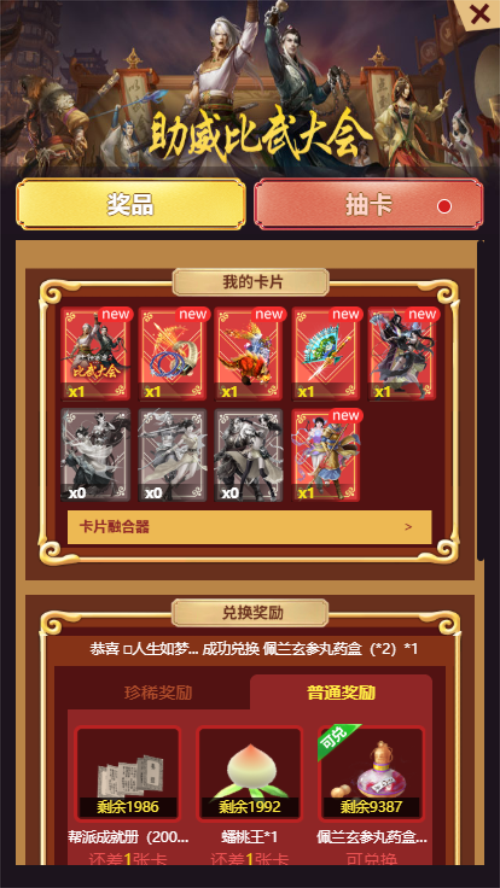 全民瞩目,热血激战!《大话西游2经典版》比武大会又将火热开启,赛事牵动着万千玩家的关注,本届赛事不仅有大家所期待的顶级战队PK,大话西游2还为大家带来了一个全新的福利活动“助威比武大会”。即日起至3月26日,参与助威活动不仅可以为你心仪的战队助力,更有机会得到一级神兵、一阶仙器、龙之骨、胫骨提气丸、亲密丹(10000)等多重游戏好礼! 看CC直播比武大会 赢取丰厚好礼 即日起至3月26日,大家通过CC直播手机端、pc端、web端或者在游戏中直接进入大话2经典版直播间均可参与活动。完成相关任务,就可以直接获得卡片或者获得抽取卡片的机会,集齐相应的卡片即可兑换丰厚奖励! 活动共有9种卡片,每个奖励对应不同的卡片组合,大家可以根据自己拥有的卡片进行选择兑换。此外,用户多余的卡片可通过融卡器进行融合,每3张卡可融合一次,有机会得到稀有卡或抽卡机会。 奖品分为珍稀奖励和普通奖励,其中珍稀奖励每个用户在活动期间只能兑换其中一个奖励,普通奖励可兑换多个。 暖心攻略奉上 赢取更多抽奖机会 如何获得更多的抽奖机会和卡片呢?这里为大家带来了一份简单的介绍—— 1、活动期间进入大话西游2经典版任意直播间直接获得1张卡片; 2、3月14日、3月15日观看比武大会官方直播5分钟即可获得2次抽卡机会; 3、活动期间每日观看大话西游2经典版直播10分钟获得2次抽卡机会; 4、活动期间每日发1条弹幕获得1次抽卡机会; 5、活动期间绑定大话西游2经典版游戏角色可直接获得1张卡片。 只要在活动期间登录CC直播观看比武大会以及绑定角色就可以直接获得卡片,真的是不容错失哟! 看CC直播,关注比武大会,一起为喜爱的战队加油打气,赢取一级神兵、一阶仙器、龙之骨、胫骨提气丸、亲密丹(10000)等丰厚奖励! |