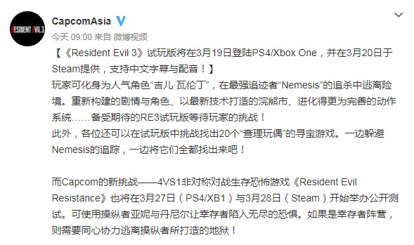 近日卡普空宣布《生化危机3:重制版》试玩版将于3月19日登陆PS4/Xbox One,3月20日登陆Steam,支持中文字幕与配音。官方还表示试玩版没有时间和次数限制,玩家可以随意游玩,尽情享受游戏乐趣。 《生化危机3:重制版》试玩版中,玩家将化身为吉儿·瓦伦丁,在最强追迹者“Nemesis”的追杀中逃离险境。重新构建的剧情与角色、以最新技术打造的浣熊市、进化得更为完善的动作系统……备受期待的RE3试玩版等待玩家的挑战! 此外,玩家还可以在试玩版中挑战找出20个“查理玩偶”的寻宝游戏。一边躲避Nemesis的追踪,一边将它们全都找出来! 卡普空的新挑战——4VS1非对称对战生存恐怖游戏《生化危机:抵抗计划》也将在3月27日(PS4/XB1)与3月28日(Steam)开始举办公开测试。可使用操纵者亚妮与丹尼尔让幸存者陷入无尽的恐惧。如果是幸存者阵营,则需要同心协力逃离操纵者所打造的地狱! |