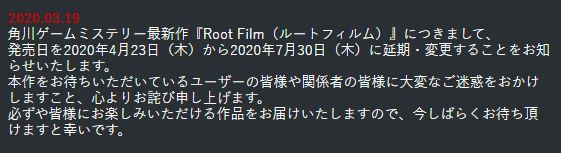 今日(3月19日),角川游戏宣布系列新作《方根胶片(Root Film,ルートフィルム)》延期发售,该作此前的发售日为4月23日,现延期至7月30日。 在《方根胶片》的官网公告中,角川方面表示目前《方根胶片》的开发已经进入了最后阶段,但为了进一步提高游戏质量,他们决定延期发售。 此前,云豹娱乐曾宣布代理《方根胶片》的中文版,并计划于2020年春季推出,目前看来中文版相关的计划也会因此延后。 《方根胶片》是《方根书简》的续作,与前作一样故事背景设定在岛根县。箕星太朗也会以他独特的艺术风格重新设计角色。偶像组合i☆Ris将会参与到游戏中,为《方根书简》的主要角色配音。 《方根胶片》将于7月30日正式发售,登陆PS4,Switch平台。 |