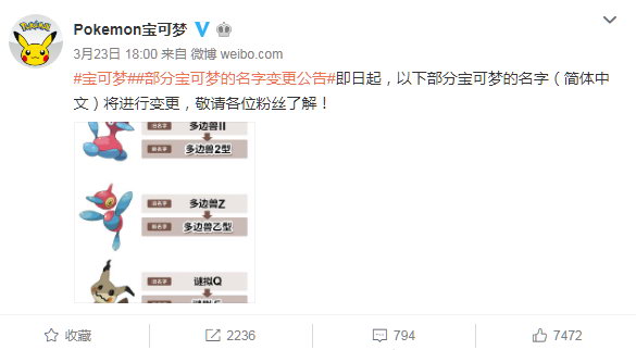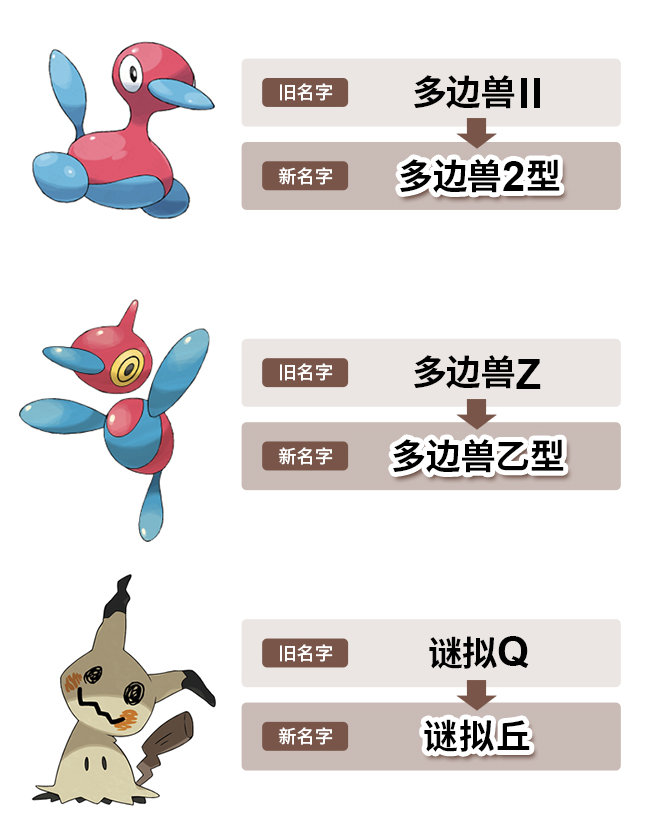 近日Pokemon宝可梦官方在微博上发布公告,部分宝可梦的简体中文版名字将进行变更,“多边兽II”将更名为“多边兽2型”,“多边兽Z”将更名为“多边兽乙型”,“谜拟Q”将更名为“谜拟丘”。 微博原文: 部分宝可梦的名字变更公告!即日起,以下部分宝可梦的名字(简体中文)将进行变更,敬请各位粉丝了解 ! |