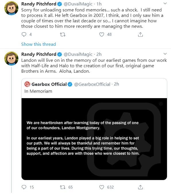 今天(3月26日)因《无主之地》系列而被玩家们熟知的开发商 Gearbox 在官方 Twitter 上确认,联合创始人之一的 Landon Montgomery 不幸去世,Gearbox 也向这位在公司早期给予巨大帮助的创始人致上了哀悼,同时也向他的朋友与家人表达了关怀与支持。 Gearbox 官方说道: 今天当我们得知公司的联合创始人 Landon Montgomery 不幸去世的消息后,都感到了无比的心碎。 在我们的早期岁月,Landon 在帮助我们设定路线的工作中扮演了一个极为重要的角色。我们将会一直感谢并记住他,并使其成为我们生活的一部分,在这艰难的时期,我们的哀思、支持与怀念将与所有 Landon 亲近的人们同在。 Gearbox 现任首席执行官 Randy 也在个人 Twitter 上回忆了与 Landon 共事的岁月,从《半衰期》、《光环》到他们的首个原创游戏《战火兄弟连》,Landon 的作品可以说影响到了非常多玩家,虽然在2007年 Landon 离开 Gearbox 后的时间里他们只见过寥寥数面,但心中的震惊与悲伤依旧难以言表。 愿 Landon Montgomery 一路走好 |