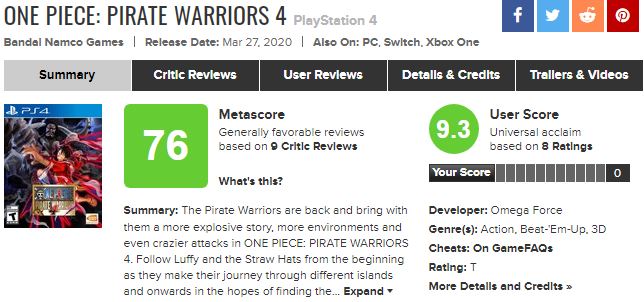 由光荣特库摩开发,万代南梦宫发行的无双动作游戏《海贼无双4》已于日前正式发售,IGN 今日(3月28日)对这款漫改游戏打出了8分的好评。 IGN 评测视频: IGN 评分 8 分:凭借着大量的可用人物和简单但有趣的战斗,《海贼无双4》很好的将《海贼王》元素糅合到了无双游戏之中。 IGN 总评:尽管有着不少缺点,但《海贼无双4》仍旧是一款很棒的《海贼王》游戏,标志性的红色纽扣上衣和草帽,该作巧妙的战斗设计极大的减少了无双系列一以贯之的乏味缺点。如果不是《海贼王》的粉丝,想让他购买《海贼无双4》恐怕不是一件简单的事情,但是作为一名热爱《海贼王》,并且对无双游戏有点兴趣的人来说,《海贼无双4》带给了我巨多的快乐。 M站媒体均分76,用户均分9.3 Steam 好评率 81% 特别好评 《海贼无双4》现已登陆 PS4、XBOX ONE、Switch、PC 平台。 |
