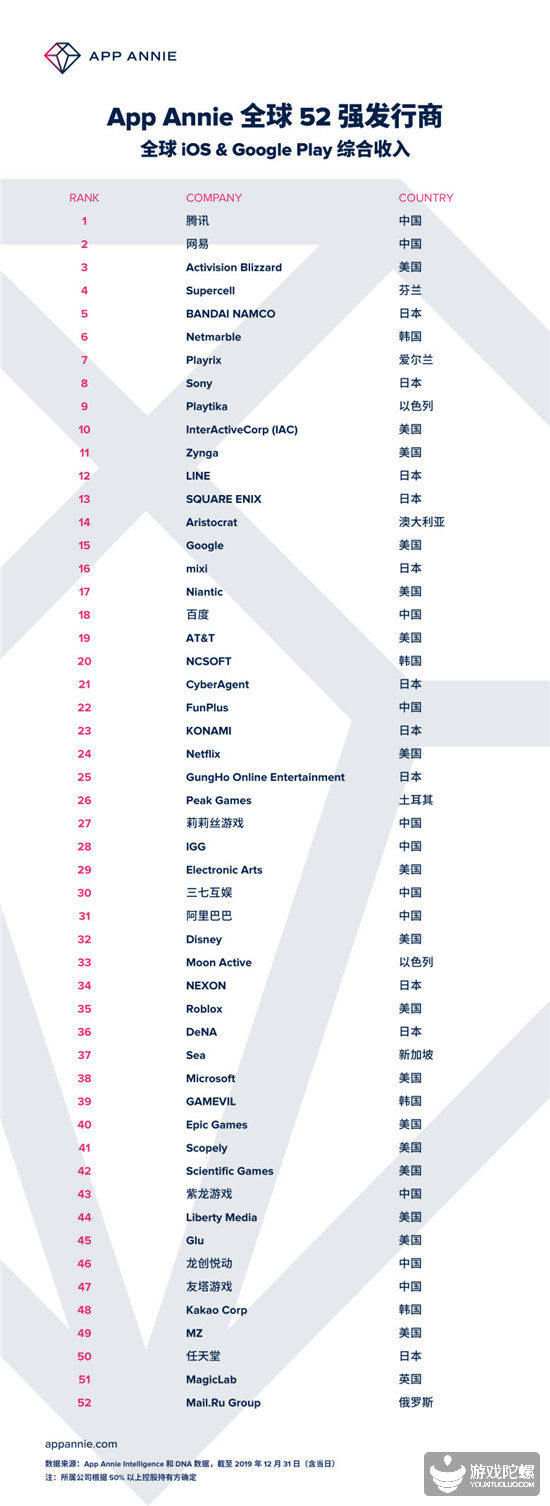 App Annie数据最近公布了一份数据,全球52强游戏发行商&综合收入,国内11家游戏公司上榜,腾讯入股的“腾讯系”公司更是高达10家,一起来看看具体的榜单情况。 全球52强发行商,国内11家公司上榜 其实大家最关注的还是52强当中的中国发行商。此次排名,来自国内的游戏厂商共有11家,分别是腾讯、网易、百度、FunPlus、莉莉丝、IGG、三七互娱、阿里巴巴、紫龙游戏、龙创悦动以及友塔游戏。 此次统计,莉莉丝和友塔游戏不出意外的成为了2019年从海外到国内的“王者”。自2019年以来,这两家公司就一直是各大报道心中的头条,尤其是莉莉丝,凭借一手《剑与远征》稳居新用户与营收排行榜双前列。友塔游戏的《黑道风云》稳居日本市场畅销榜前列,其影响力同样令人咋舌。 腾讯和网易就更不用说了,自上一年榜单,就始终位于冠亚军。两个大厂凭借着自身产品过硬的拳头产品,多品类布局,不止占据国内游戏市场第一、第二,在海外发行榜上,也同样领跑,稳居前一、二名。 收入百亿俱乐部,20亿只是入门门槛 纵览52强,可以发现榜单中超过半数的发行商都来自亚洲,位于榜末的Mail.Ru Group公司年收入为20亿元人民币,这也就意味着入榜收益至少要大于这个数。 进入前十强的门槛,为全年收入高于88亿元人民币。这个数据是根据位于榜单第11名的Zynga公司计算,其年收入为12.48亿美元(折合人民币约88亿元)。 值得注意的是,原本52强排名收入的估算,不包含应用内广告收入。而在估算My.Games移动端收入的时候,却将广告收入算了进去。这是考虑到榜单中是以母公司Mail.ru进行排名计算,也就是包含非游戏移动端收入。因此我们以20亿元作为榜单入门门槛供大家参考。 腾讯系独树一帜,海内外备受瞩目 什么是所谓的腾讯系公司呢,那就是腾讯入股的公司,包括动视暴雪、Supercell、Netmarble、Roblox、Sea、Epic Games、Glu以及Kakao Corp。 正所谓运营得好不如投得好,这一点腾讯向来眼光独到,这十家公司在市场上独树一帜,在他们各自的领域里都拥有着不可动摇的地位。从产品到平台流量、从欧美到亚洲形成全面包围态势,拥有其他厂商难以比肩的资源优势。 名次提升较大的是Roblox(上升8个名次至35名),这家在线游戏创造平台在全球200个国家和地区拥有超1.15亿位Z世代玩家,刚在上月底完成1.5亿美元G轮融资(腾讯参投),估值达到40亿美元。 4、哪些热门游戏品类,占据发行大头? 在全球市场上,吃鸡类、SLG、消除与建造类、博弈类最受发行商青睐。吃鸡类游戏作为前段时间主播的心头肉,虽然近期热度下降,吃鸡类游戏下载量暴跌百分之五十。但值得关注的是,其收益却提升了百分之四十。 日本非常受欢迎的《黑道风云》,也意味着SLG类游戏进入了一个拼实力的时代。这类游戏最容易勾起玩家的情怀,尤其像《守望黎明》这类,充斥着时代和背景的浓烈异味色彩,最能够抓住玩家的心。下载量下降了百分之十,营收增长了百分之二十,有一定的留存压力。 玩消除类游戏的人群,打发时间的要占大多数。2019年下载量下降了百分之十五,收入下降了百分之一。由此可见它在市场上没有太多机会。 但是随着开发者脑洞大开,加上了建造类的消除游戏,打开了一片新天地。2019年营收增长百分之六十五,下载量的增加更是高达百分之九十六,可以看出这类游戏的潜力是无限的。 博弈类包括传统博弈类和混合博弈类,虽然传统博弈类营收和下载量的变动不大,但2019年营收增长百分之四百的混合博弈类,让发行商们看到希望。即使目前情况占好的只有《金币大师》一款游戏,但它却完完全全推动了这类游戏在市场上的比重。 以上就是对全球52强发行商的解读,在其中我们也看到了亚洲,特别是中国,游戏厂商实力强劲,在全球发行市场中具有一定的影响力,国内游戏产品也更大范围在海外发行。对此榜单,你又有什么看法呢? |