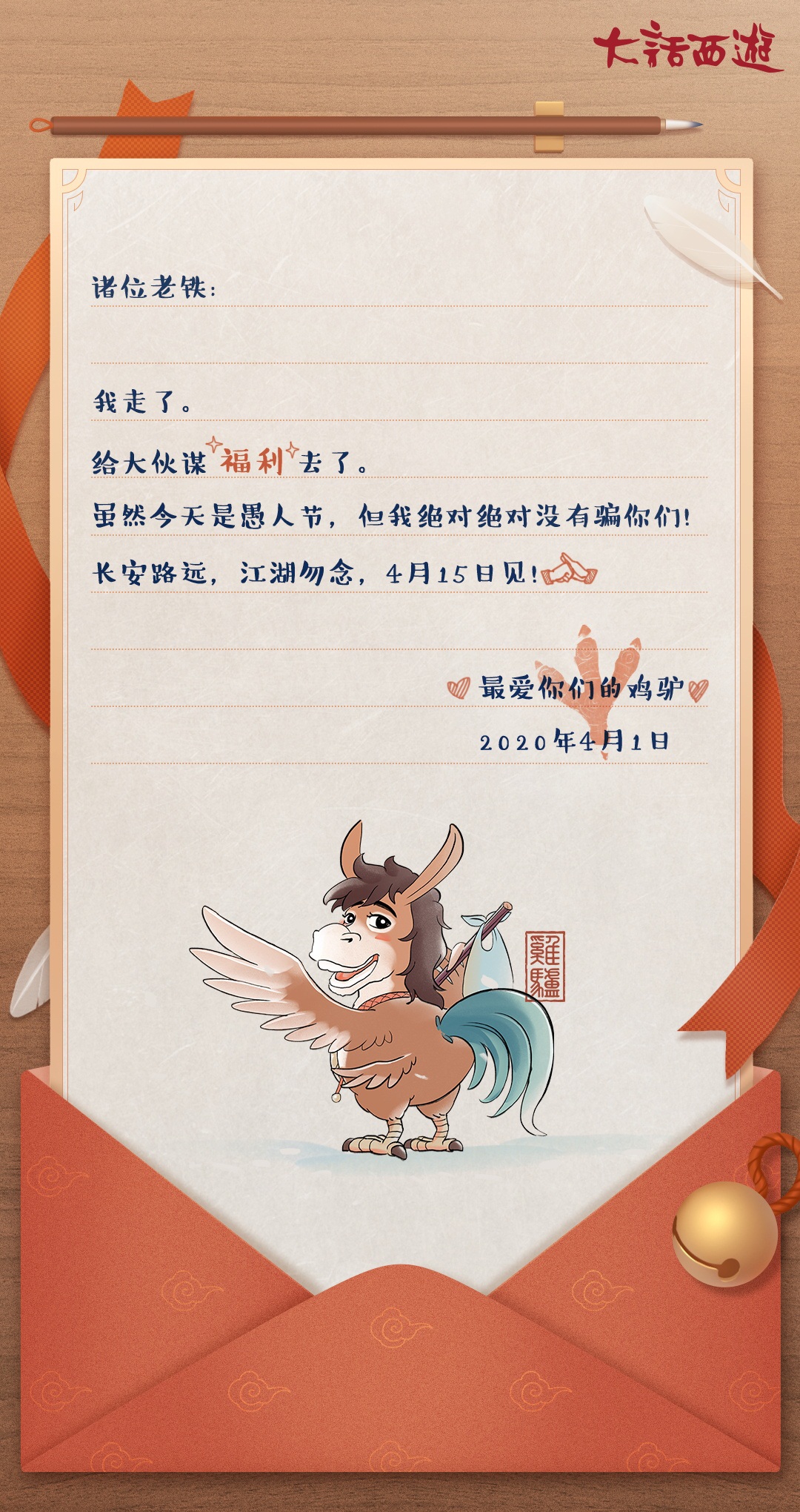 4月1日《大话西游2》出了一个重磅消息轰动三界:“大话全民福星鸡驴离家出走了!” 二哥本以为是愚人节的玩笑,谁料到电脑后面、会议室里,到处都没找到鸡驴。鸡驴真的离家出走了!是对伙食不满意,还是在密谋着不为人知的大事情?面对鸡驴突然消失,二哥现在心中万分着急,当下决定悬赏重金寻找鸡驴,各位大话兄弟们快来帮二哥找回鸡驴吧! 留信出走 鸡驴到底去哪儿了? 发生鸡驴大神消失这样的事情,大家都意想不到。不过好在鸡驴出走之前,也留下了一些蛛丝马迹——在二哥桌上留下了一封书信。细看这封信,二哥还怪感动的,鸡驴在信上说,自己是出发去给大家谋福利,更写下了“长安路远,江湖勿念,4月15日见!”但是鸡驴到底去了哪里没有透露,4月15日将发生什么事情也没有说明。 想起今天在红拂女朋友圈,还看到她说过几天和鸡驴要去约会,鸡驴说要在一个地方等她。图里到底是什么地方,有老铁知道吗? 有奖寻驴 提供线索二哥送福利 难不成鸡驴离家出走是去找红拂女了?不对,不对,不对!鸡驴说给老铁们谋福利去了!二哥冷静回忆了一下鸡驴大神那天肝完Boss…… 现在二哥心中一半是焦躁,一半是问号,只能向各位兄弟求助力了。如果你手中掌握了鸡驴的线索,或者有高明的论断,或者听到一些江湖传言有所推测,还请马上告诉二哥。二哥已正式宣布“有奖寻驴”,只要提供了猜想与线索,二哥就将随机抽取热心的兄弟,送出鸡驴挂件、鸡驴公仔、鸡驴手偶三件套周边好礼! 想要获得精美的鸡驴三件套周边吗?赶紧来《大话西游2》评论留言,大开你的脑洞吧! |
