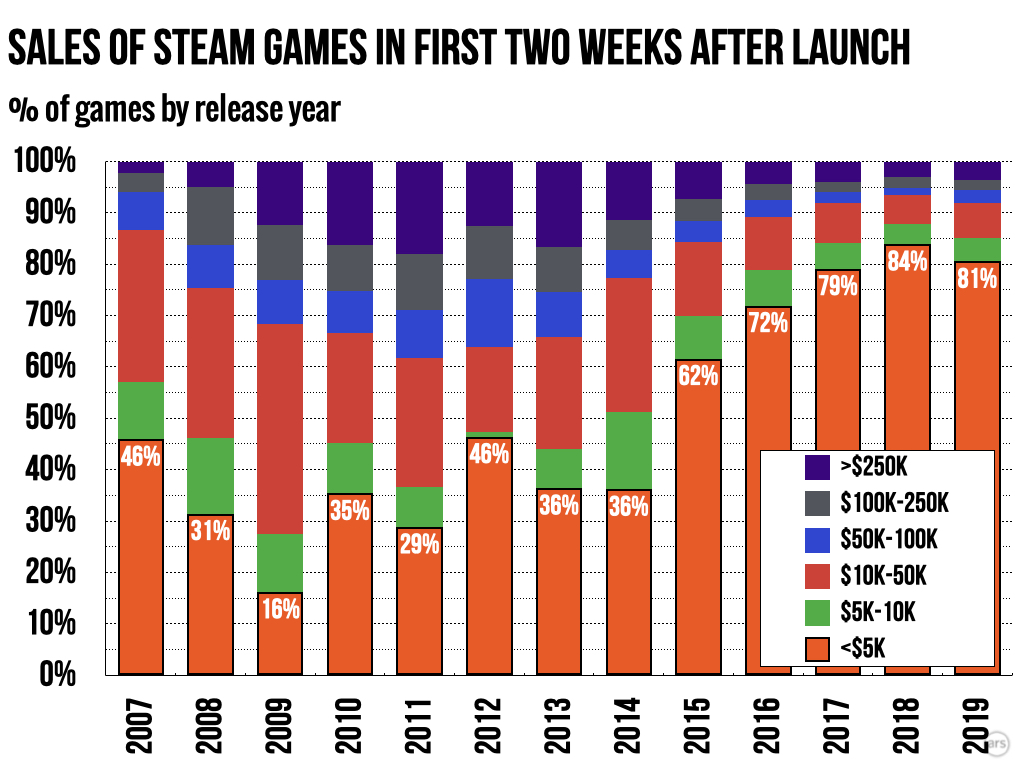 昨天Steam官方发表了一篇文章,文章中称越来越多的新品游戏取得成功,初步分析结果是:发售后头两周收入超过1万美元的游戏数量始终在上升,2019年达到最高(接近1200个),2019年较2018年上升了18%。然而外媒Ars Analysis发现,过去5年,发售两周收入还不到5000美元的游戏占了Steam发行游戏的绝大多数(80%)。 自V社关闭Steam Spy庞大的随机抽样销量预估来源并承诺以“更为准确更有用”的替代之后已经过去了差不多2年时间。V社近日非常罕见地展示了其数千款PC游戏的销售数据,让我们首次看到了这种替代可能带来的结果。V社的博客准确地指出自2012年以来(当时V社推出了Steam绿灯,对上架游戏放松了管制)在Steam上取得最低层面成功的游戏数量已经大大增加,但V社选择性的数据展示遗漏了大量发售两周后收入还不到5000美元的游戏。Ars Analysis推出的一项分析发现,这些游戏是过去5年里Steam发售游戏的绝大部分。 Steam发售游戏头两周收入,可以看到从2015年到2019年,绝大多数游戏发售头两周的收入低于5000美元,在5000-10000美元之间的游戏也非常少。最近几年中Steam发售游戏数量的增长,大部分是来自那些发售两周收入低于5000美元的游戏 如果只专注于收入超过5000美元这一“成功”门槛,可以看到Steam这些年以来的“赢家”越来越多,但同时也有大量的“输家” 在今天,Steam上发售的游戏,有五分之四的游戏在发售两周内收入不到5000美元 |