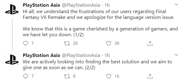 相信曾在 PS Store 购买过游戏的玩家都有所了解,很多游戏在登陆 PS Store 后会上架多个不同语言的版本,例如《最终幻想 7:重制版》就在商店中拥有【中韩文版】与【日英文版】两个版本。随着今天(4月10日)《最终幻想 7:重制版》的正式发售,很多亚洲区玩家(母语为英文)发现自己在预购通道中购买的竟然是【中韩文版】,真的是一点都看不懂。 、 PS港服中就能看到两个不同语言的《最终幻想》 据了解,PS Store 亚洲区预购通道中的《最终幻想 7:重制版》被默认设定为了【中韩文版】,这导致很多母语为英文的玩家一不留神就买错了版本。刚刚 PlayStation Asia 官方已经在 Twitter 上向所有因这个错误而购买到【中韩文版】的玩家致上了歉意,并表示他们正在努力寻找解决方法。 PlayStation Asia 官方说道: 嗨大家好,我们理解各位用户对于《最终幻想 7:重制版》的不满情绪,同时也为语言版本问题致歉。我们知道这款游戏被一代玩家们所珍视,然而我们让大家失望了。 我们正在积极寻找最好的解决方案,并且正尽可能快地推出一个方案。 |