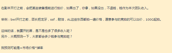 一说到怀旧服里的G团,玩家们都会想到推到BOSS以后团长在线推销装备的画面。最近有玩家提出了一个全新的玩法,那就是在开打前就把装备先拍好。 具体来操作来说,就是在BWL团队组齐了人,在进本之前先来一波虚空拍卖,团长把龙牙、SSF、奈泪、密头等等,全部先拍一遍,这个起拍价会比通常G团里的起拍价低一些,进本以后如果出了相应的装备,就按之前拍好的价格执行,不再拍卖。 举个例子,进本前团长先把龙牙以100G起拍,想要龙牙的玩家,肯定会先试探性出价,因为100G比市场价便宜太多了。但由于不能保证一定会出,所以这个价格不会飙到太高,可能最多就出到500G就没人喊了。进本以后如果出了龙牙,就是500G入手龙牙,没出就当是损失了500G。 这样的规则有两个优点:1.装备提前拍卖好,G提前收好,副本里停下来拍卖交易的时间少,理论上打本的效率会比较高;2.好装备全都拍一遍,虽然每一件的价格比市场价低,但拍卖的件数更多,实际上分G差距不会太大。但也有几个缺点:1.进本前需要花费的时间更多,总效率其实差别不大,2.提前就能大致知道总收益,积极性或许会受影响。 对于玩家提出来的这套富贵险中求的玩法,大多数网友的态度还是不太看好的。虽然说这个规则很有新意,怀旧服里很少见到,但毕竟是薛定谔心理,风险还是比较大的。 小伙伴们觉得这个玩法怎么样呢?欢迎在下方留言。 |