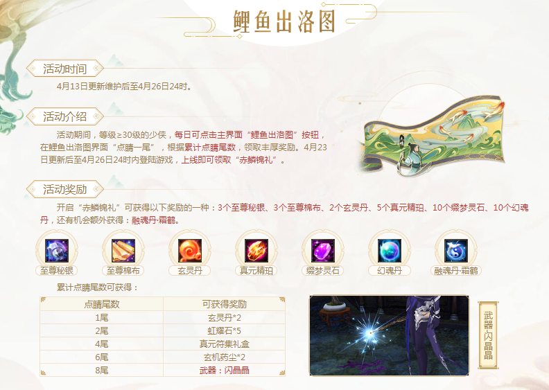自2007年开始的缘分,让亿万玩家在这片武侠梦的江湖相遇相知,在漫长的岁月里,并肩征战,风雨携手同行。过去的2019,我们梦回大宋瑞贺千秋,携手非遗宋锦,还原宋制婚礼,在原汁原味的宋文化江湖中共庆十二周年。即将到来的十三周年,我们将为所有热爱这片江湖的少侠带来全新的感动!《新天龙八部》国韵盛典即将开启,带你品味最传统的东方美学与文化。 【缘起·国韵】 从牙牙学语,口中念出的天地玄黄,到初始人事,耳边环绕的宋词文章……古老中华携着积淀千年的悠悠古韵,自辉煌与风雨中而来。经由亘古朝代更替的人口迁徙、民族融合,国韵建立在中国文化和东方文化基础上,丰富多彩又包罗万象,扎根于每个华夏儿女的心中。他既是深刻细腻的艺术之美,也是余音绕梁的音乐之声,是融汇百家、中通圆融的广博思想,亦是中华儿女仁、义、礼、智、信的优秀品格。 时值天龙第十三周年,中华国韵将由内而外的为这片江湖注入新的灵魂,从“华裳美衣”和“丝竹流芳”,到别具匠心的“山河风华”,古老的元素与虚拟世界通过技术和理念的融合,让江湖更有历史的温度,让传承焕发更耀眼的光芒。 十三周年庆典“九州华裳”篇即将开启,首个更新袖骨技术也将现世为各位少侠增添风采,本次周年庆不仅将有全新“国风”时装与少侠们相见,还有一批经典时装也将经过袖骨革新“焕然新生”,更多精彩内容敬请期待吧! 十三周年庆专题查看>>> http://event.changyou.com/xtl/202004/ceremony/pc/index.shtml 【周年活动·启航】 十三周年我们还为少侠们准备了一系列活动共襄盛典。今日全新“鲤鱼出洛图”活动即将起航,为少侠们送出周年庆活动福利第一弹!4月13日至4月26日,等级≥30级的少侠都可参与活动,每日上线后在主界面“鲤鱼出洛图”处点击“点睛一尾”,即可参与活动,根据累计点睛尾数,领取玄机药尘、全新幻饰武器:闪晶晶等好礼。 不仅如此,在4月23日至4月26日期间符合参与条件的少侠上线更可领取“赤鳞锦礼”,开启随机获得以下奖励的一种:3个至尊秘银、3个至尊棉布、2个玄灵丹、5个真元精珀、10个缀梦灵石、10个幻魂丹 ?还有机会额外获得:融魂丹·霜鹤! 2020天龙国韵盛典正式启程,江湖万象更新,焕然新生,一幅东方美学的山水卷即将缓缓展现在众人眼前,更多精彩周年活动,敬请期待后续爆料。 |