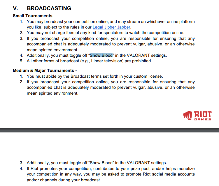 近日《英雄联盟》开发商拳头公布了其FPS游戏《Valorant》关于电竞赛事方面的规则。根据规则,拳头要求《Valorant》赛事必须将游戏中的“显示血液”选项关闭,也就是说在比赛直播中,观众不会看到飙血的场景。 为了帮助赛事举办方更清楚地了解《Valorant》的电竞生态,拳头发布了“社群竞技守则”,公布了小型、中型和大型赛事活动的基本规则。 由玩家,网吧或者是社区成员举办的当地赛事,比赛奖金最多为1万美元,主要是为了娱乐和“社交游玩”。全面性地大型赛事将由大型电竞组织比如ESL和Dreamhack通过拳头公司的全球电竞团队举办。 在“直播”规定中,不管是小型,中型还是大型赛事,都必须关闭《Valorant》游戏中的“显示血液”选项。因此在比赛中爆头时会出现火花作为替代。 外媒Polygon认为尽管血腥似乎没什么大不了,但对于有内容指导方针的广告商来说,这可能会产生很大的影响。在比赛过程中避免流血会让游戏对潜在的合作伙伴更有吸引力,因为除了大量的射击外,游戏不会有太多令人反感的内容。 此外还有面向主持人、赞助商以及合作伙伴的规则,包括在线直播比赛必须经过适当的审核,“以防止在聊天中出现低俗、辱骂或其他恶俗环境"。 |