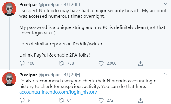 任天堂可能遭遇了一定规模的账号安全漏洞问题,且目前尚未公开。昨日任系资讯站LootPots创始人Pixelpar发推怀疑自己Switch关联的任天堂账号被黑,并称虽然所使用的的密码强度够大,其账户还是在一夜之间被多次异地访问。 该推引发了大量玩家的热议,来自世界不同地区的玩家在Reddit和推特上同样报告类似的问题,称NS上的任天堂账户出现异常登录状况。Pixelpar随后透露自己在一夜之间收到了47封任天堂的账户登录通知邮件,而他的这个账号甚至都没在自己的电脑上用网页登陆过。 有趣的是,在Pixelpar在推特吐槽账户异常不久,任天堂官方就发布公告称eShop的信用卡支付功能暂时下线。虽然两者没有直接的联系,Pixelpar还是建议出现账户异常的玩家解绑PayPal并开启二步验证。 根据Pixelpar面向这些账户异常玩家发布的问卷报告得出的结果,他推测被盗的其实是与该任天堂账户绑定的NNID密码,毕竟不少玩家在发现异常更换密码后依旧不停收到异地登录的通知。NNID即Nintendo Network ID,早前被用于3DS和Wii U,如今可以与玩家个人任天堂账户绑定,来继承部分信息。 奇怪的就在于尽管大量玩家已经汇报了同样的问题,但任天堂还是没有给出直接回应。因此建议玩家小心为上,开启二步验证或更换密码谨防中招。 |