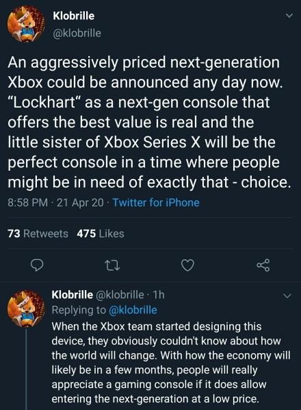之前网传低配版Xbox Series系列主机Xbox Series S(代号Lockhart)即将公布,售价300美元左右。Xbox Series S也拥有Zen 2 CPU、RDNA 2 GPU、GDDR6 内存、Xbox 高速架构和固态硬盘等,支持光线追踪。它与Xbox Series X的不同之处就在于GPU浮点性能为4TF。 近日网上又有新传闻出现,Xbox Series S或将在5月发布会活动上公布,其将以低廉的价格和稍减的机能,吸引更多的玩家。在发布会上,《光环:无限》《神鬼寓言》重启版也将有新情报放出。 知名爆料人Klobrille也爆料称,Xbox Series S售价极具竞争力,为次世代游戏提供了准入门槛。微软推出两款次世代主机,是为了给玩家更多选择。他还说微软在研发Xbox Series S时,并没有预测到未来会有何种变化。现在新冠疫情泛滥导致全球经济衰退,而低配版次世代主机的价格更实惠,将帮助微软赢得更多的市场份额。 |