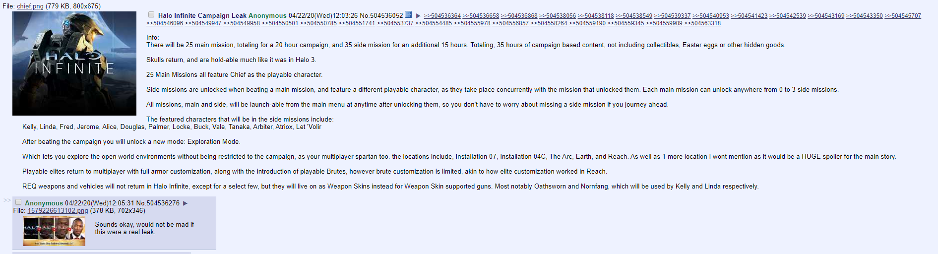 《光环:无限》作为这个微软经典系列的新作,同时又是次世代主机首作,自然吸引了无数粉丝的关注。虽然343工作室依旧对游戏的内容守口如瓶,还是不停有爆料传出,而近日源自4chan的一则爆料开始发酵,光环粉丝们称虽然其陈述的游戏剧情显得有些夸张,但关于游戏的玩法和规格的描述还是有一定可信度。 首先根据泄密者所述,《光环:无限》将会有一个长达20小时的战役,包含25个主要任务关卡。同时,假若玩家愿意探索主线外的剧情,游戏还会提供35个额外支线任务,将会增加15小时左右的游玩时长。至于游戏内容的大体框架,泄密者表示玩家将会在主线中一直扮演士官长的角色,而诸如神风烈士、鬼面兽Atriox、洛克、帕尔默等系列玩家的老熟人都会一一回归。 而关于游戏剧情,爆料人称直接承接《光环5:守护者》,士官长设法令科塔娜从暴走状态中恢复,并启动一个计划阻止银河大战的发生。而致远星将会是《光环:无限》最终剧情的所在地,剧情中的时间旅行元素将会重启整个《光环》系列。 343工作室尚未进行证实或辟谣,但是根据之前一些《光环》周边玩具所给出的暗示,系列经典的武装造型和敌人可能回归,符合其时间旅行的描述。 |