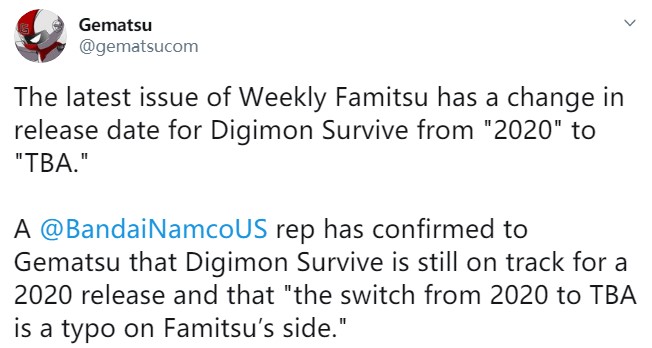 昨日,据速报杂志报道,《数码宝贝:绝境求生》发售日期变成了“未定”。今日(4月23日),据外媒gematsu向万代南梦宫求证,万代表示,《数码宝贝:绝境求生》的跳票有误。 据外媒gematsu发布的推特显示,关于之前速报杂志报道的“《数码宝贝:绝境求生》发售日期为待定”,gematsu向万代南梦宫进行求证,万代南梦宫(美国)回应:《数码宝贝:绝境求生》目前正在以2020年发售为目标顺利开发,此前“《数码宝贝:绝境求生》发售日期为待定”的消息应该是速报的错误消息。 《数码宝贝:绝境求生》将于2020年登陆PS4/Xbox One/PC和Switch平台。 |